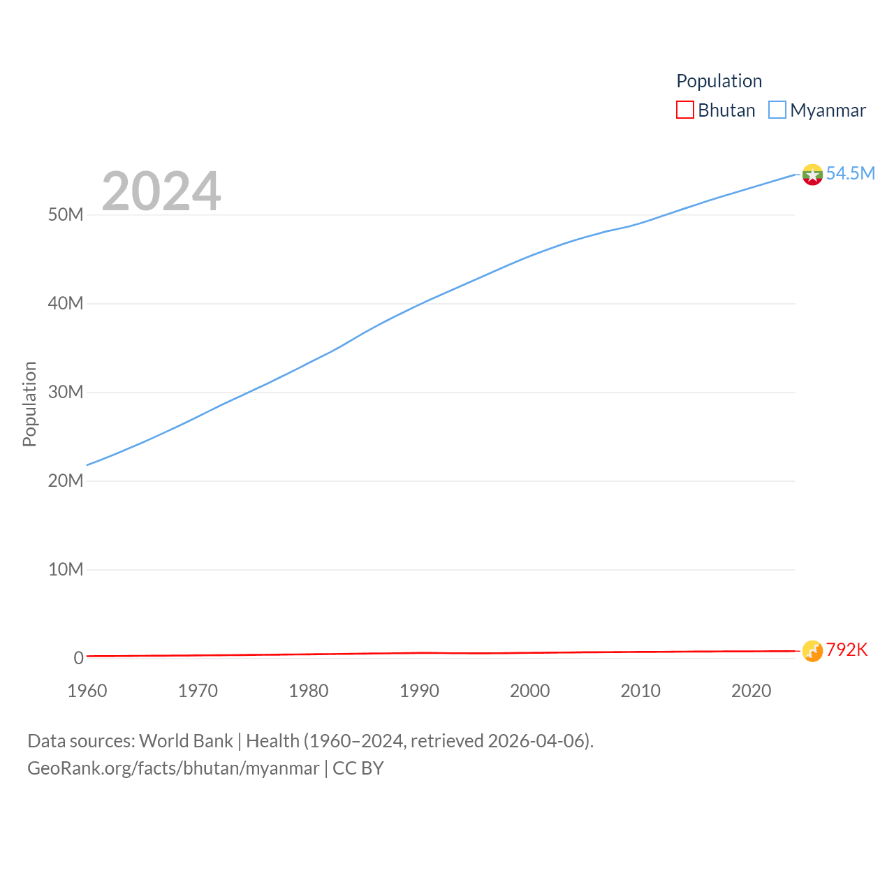 Bhutan has a population of 792K (ranked 163/197), compared with 54.5M in Myanmar (ranked 27/197). Bhutan's land area is 14,726 sq mi versus 251,997 sq mi for Myanmar (ranked 132nd vs. 39th).