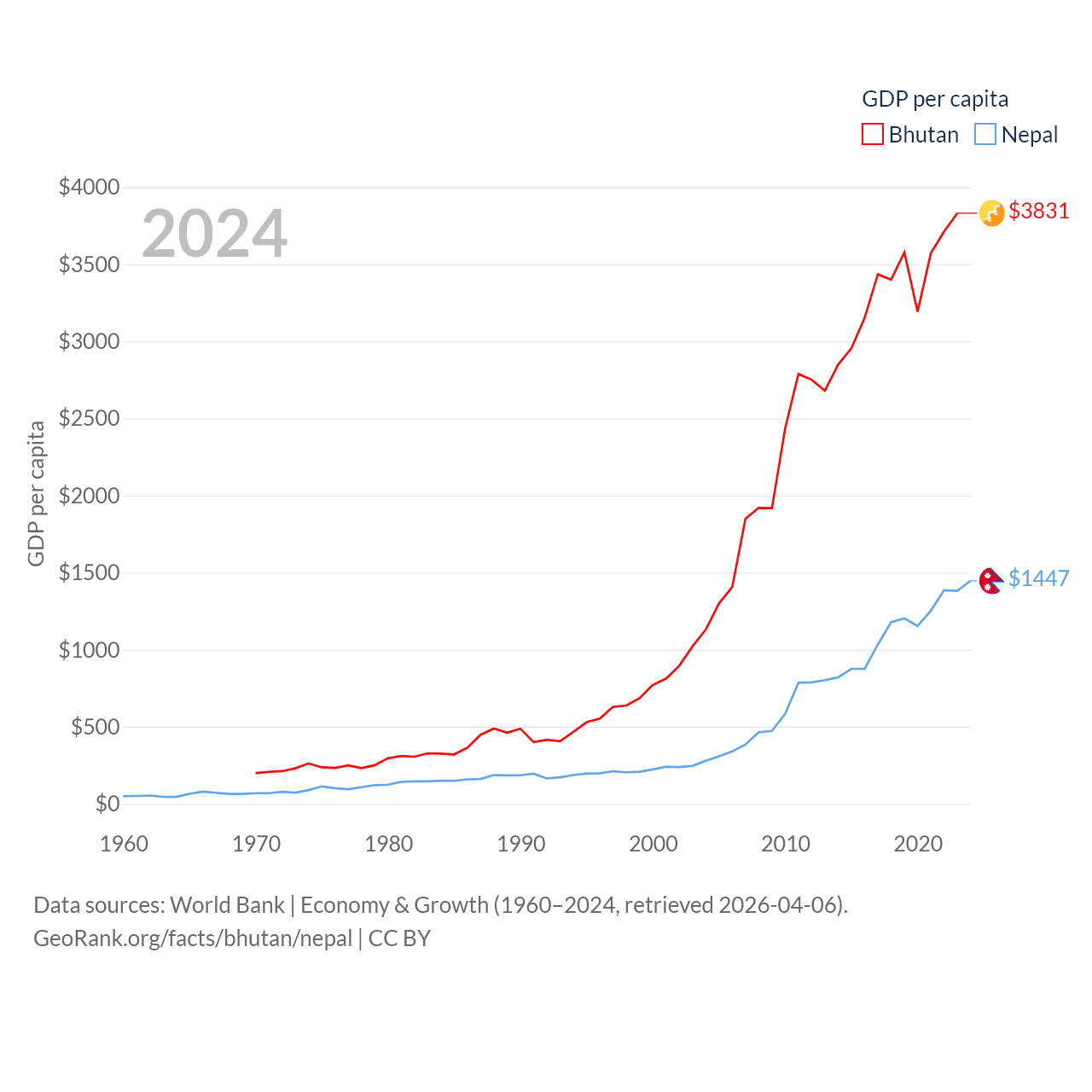 By GDP, Bhutan ranks 170/197 ($3.01B) and Nepal ranks 101/197 ($42.9B). By GDP per capita, Bhutan ranks 132/197 ($3,831), while Nepal ranks 164/197 ($1,447).