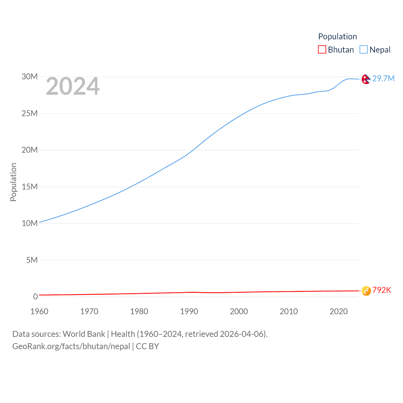 Bhutan has a population of 792K (ranked 163/197), compared with 29.7M in Nepal (ranked 51/197). Bhutan's land area is 14,726 sq mi versus 55,348 sq mi for Nepal (ranked 132nd vs. 92nd).