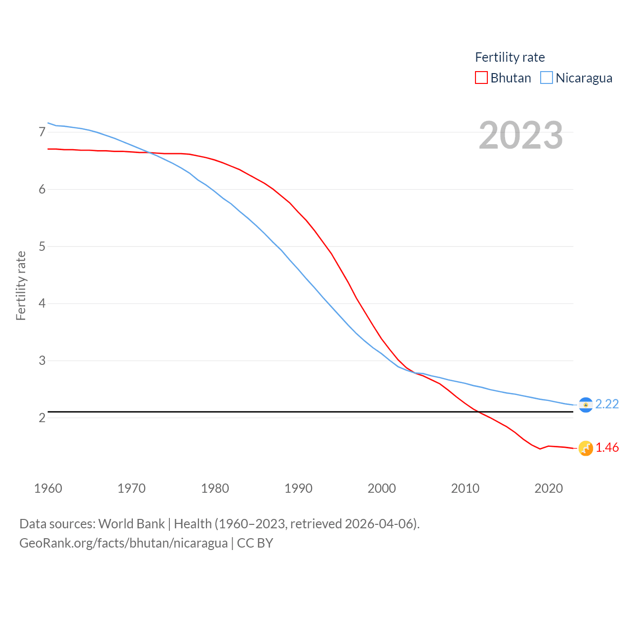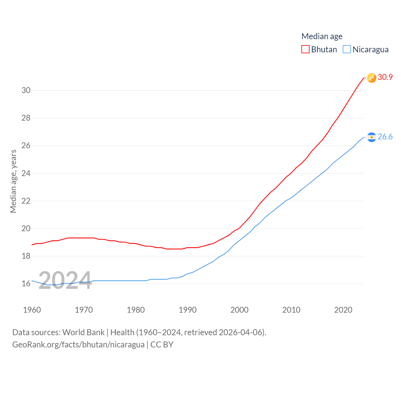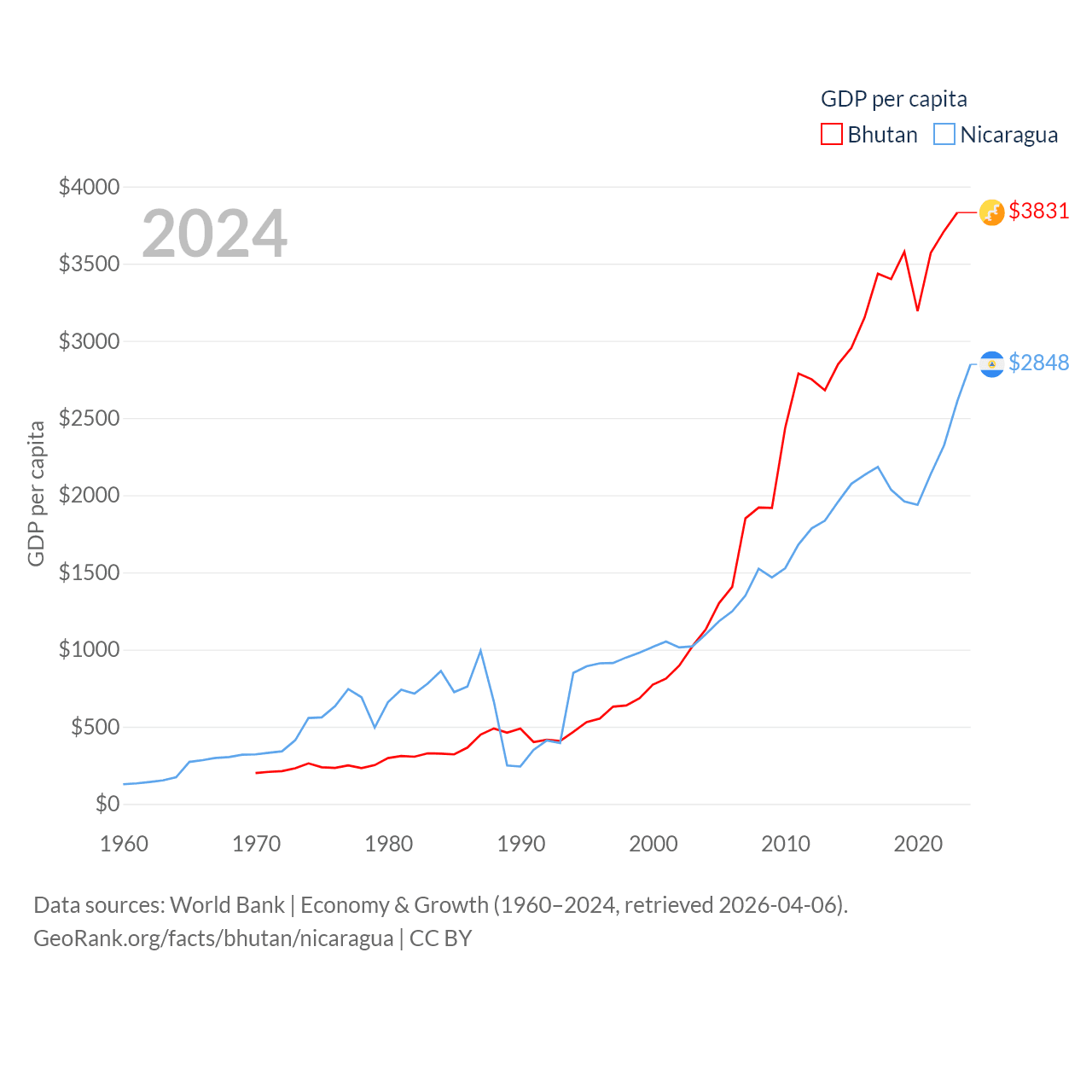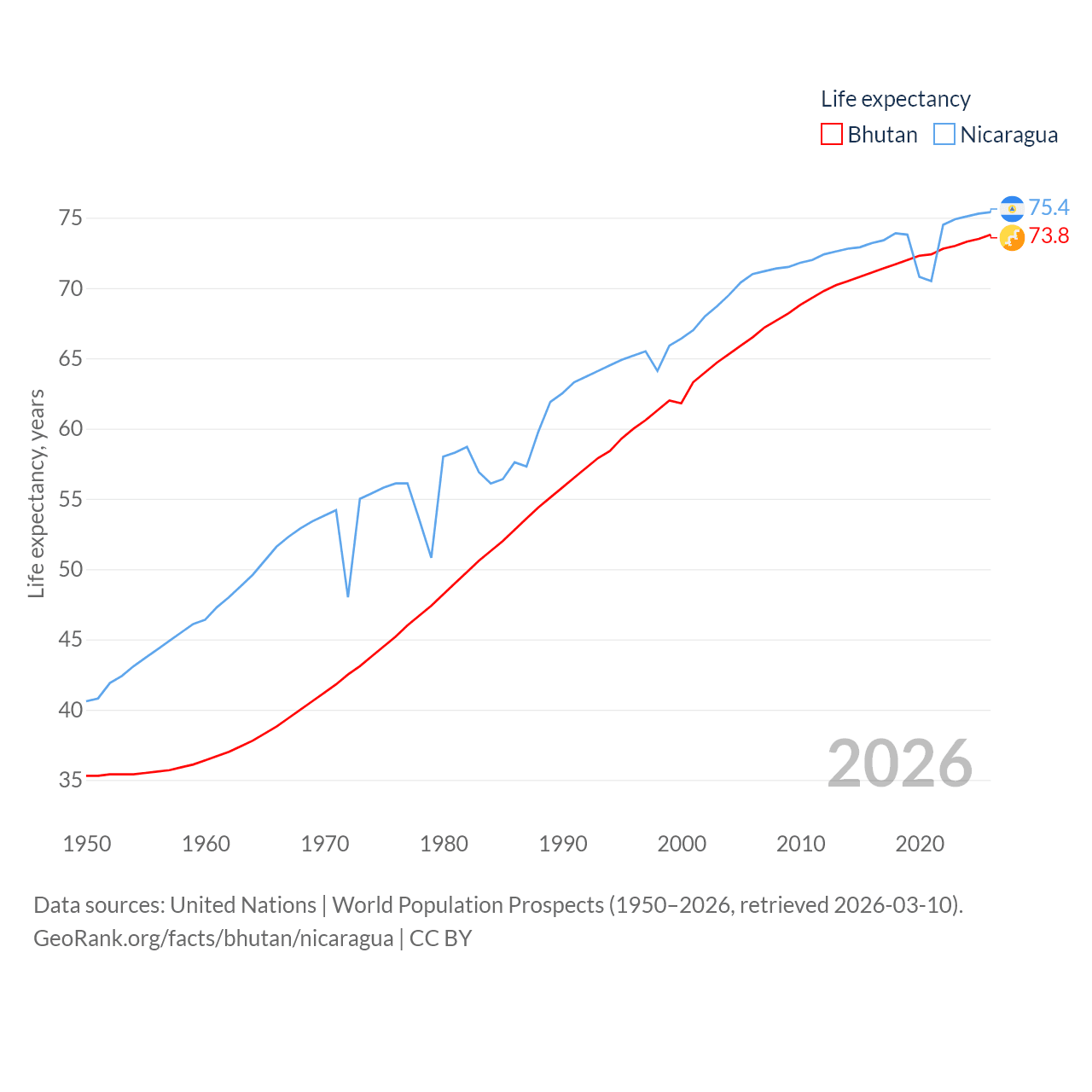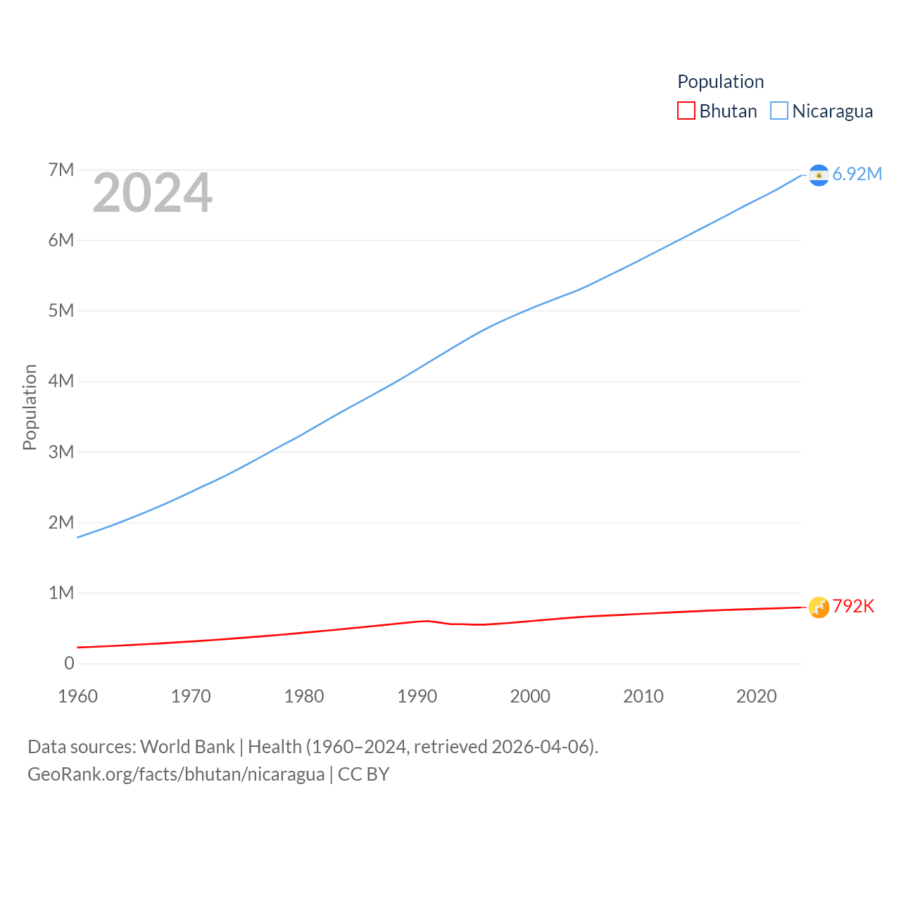 Bhutan has a population of 792K (ranked 163/197), compared with 6.92M in Nicaragua (ranked 108/197). Bhutan's land area is 14,726 sq mi versus 46,464 sq mi for Nicaragua (ranked 132nd vs. 98th).