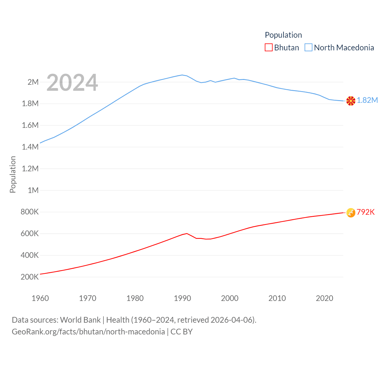 Bhutan has a population of 792K (ranked 163/197), compared with 1.82M in North Macedonia (ranked 150/197). Bhutan's land area is 14,726 sq mi versus 9,737 sq mi for North Macedonia (ranked 132nd vs. 145th).