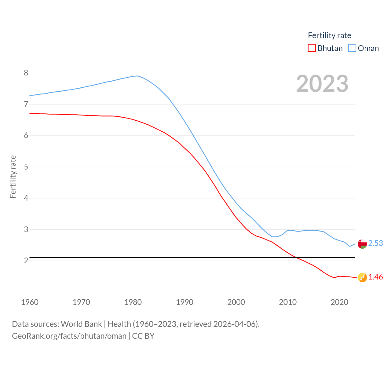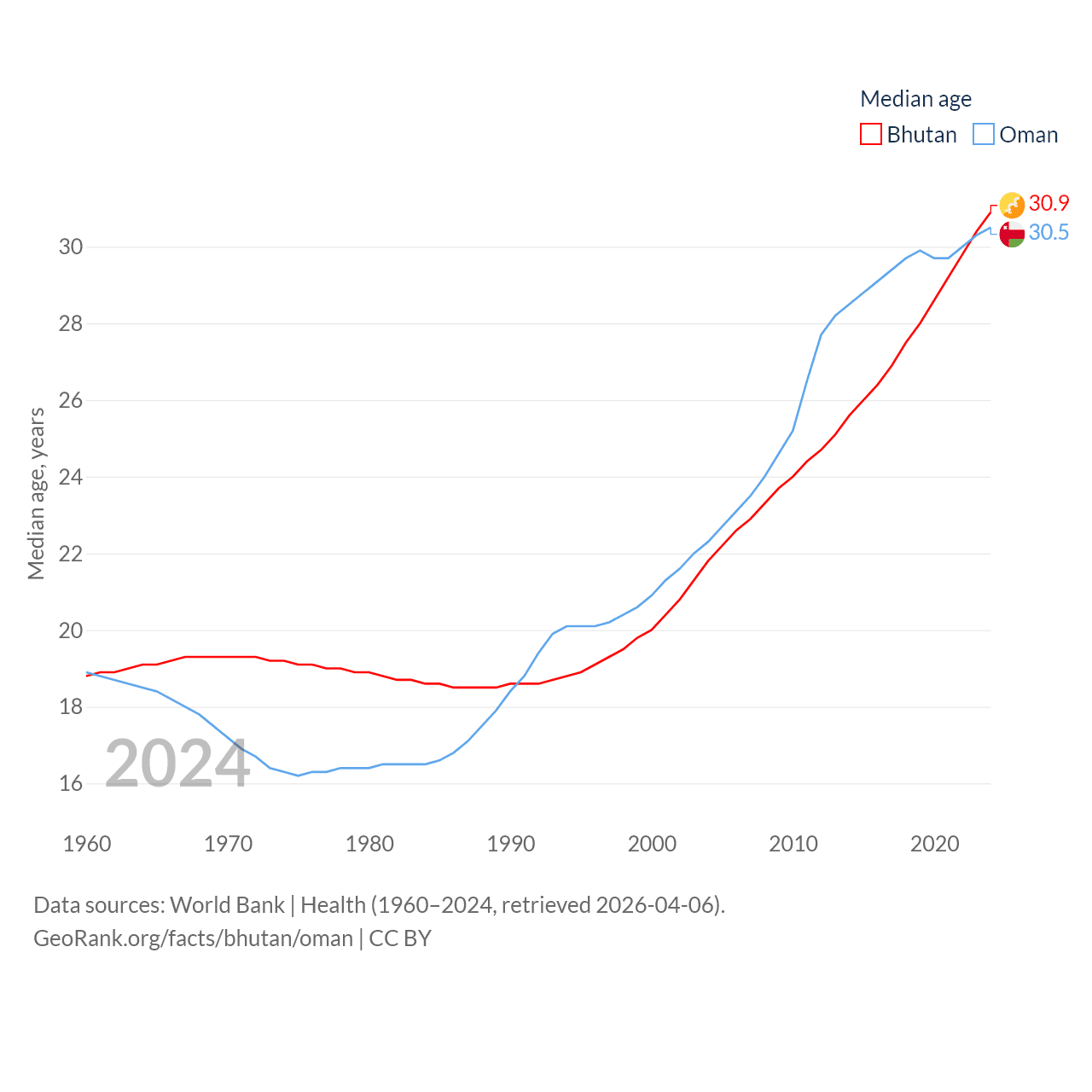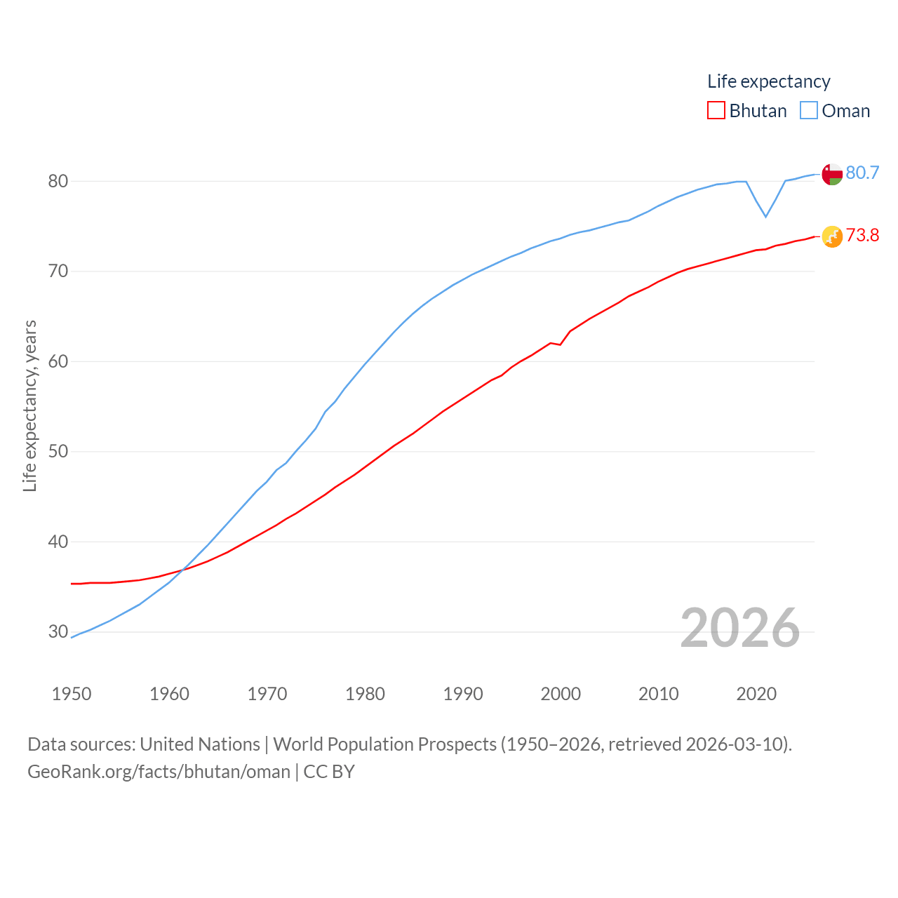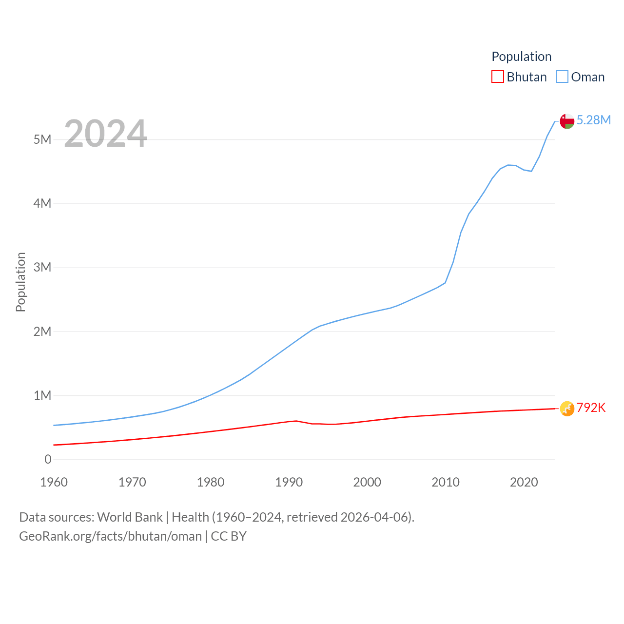 Bhutan has a population of 792K (ranked 163/197), compared with 5.28M in Oman (ranked 124/197). Bhutan's land area is 14,726 sq mi versus 119,499 sq mi for Oman (ranked 132nd vs. 68th).