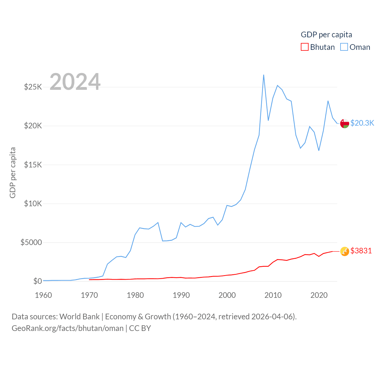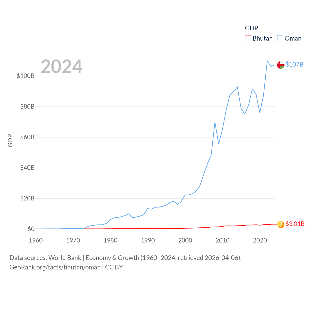 By GDP, Bhutan ranks 170/197 ($3.01B) and Oman ranks 70/197 ($107B). By GDP per capita, Bhutan ranks 132/197 ($3,831), while Oman ranks 57/197 ($20,285).