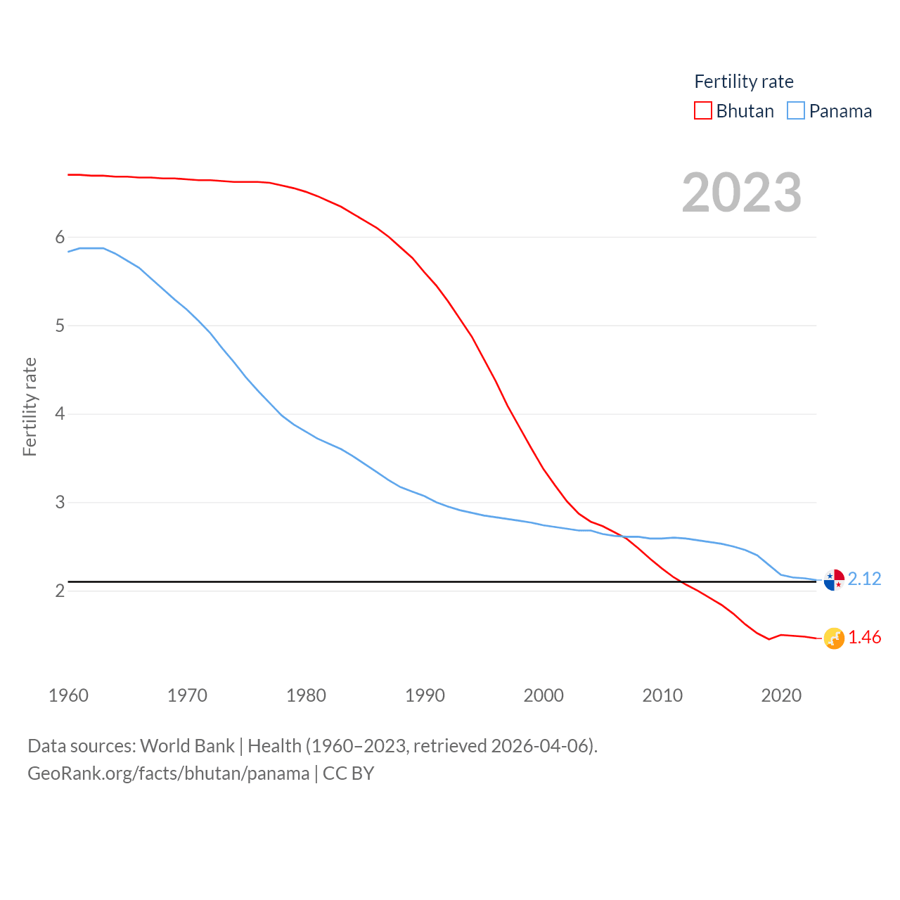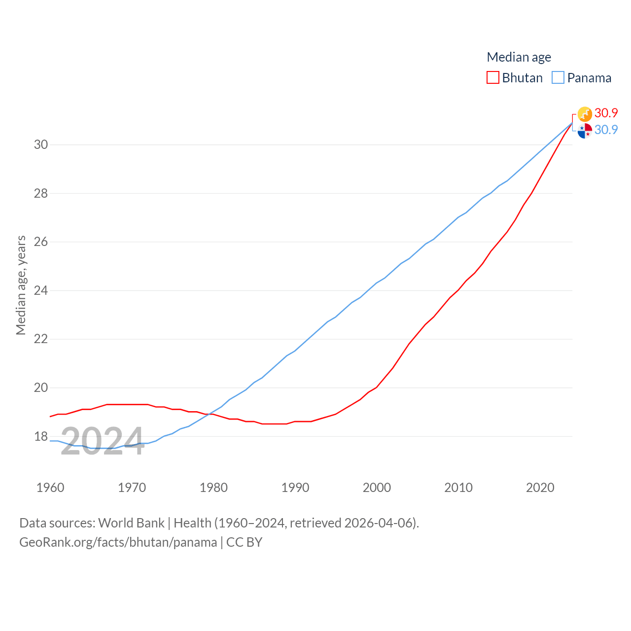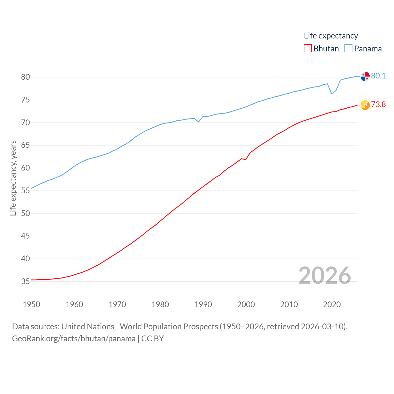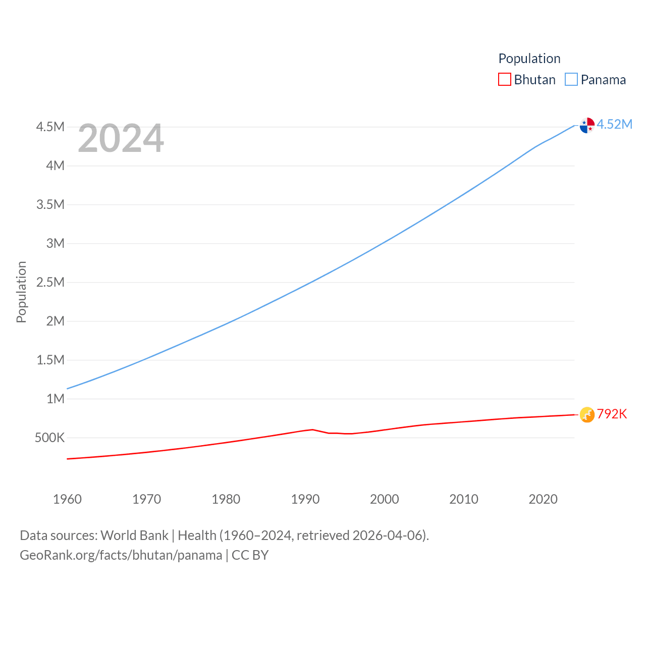 Bhutan has a population of 792K (ranked 163/197), compared with 4.52M in Panama (ranked 128/197). Bhutan's land area is 14,726 sq mi versus 28,641 sq mi for Panama (ranked 132nd vs. 115th).