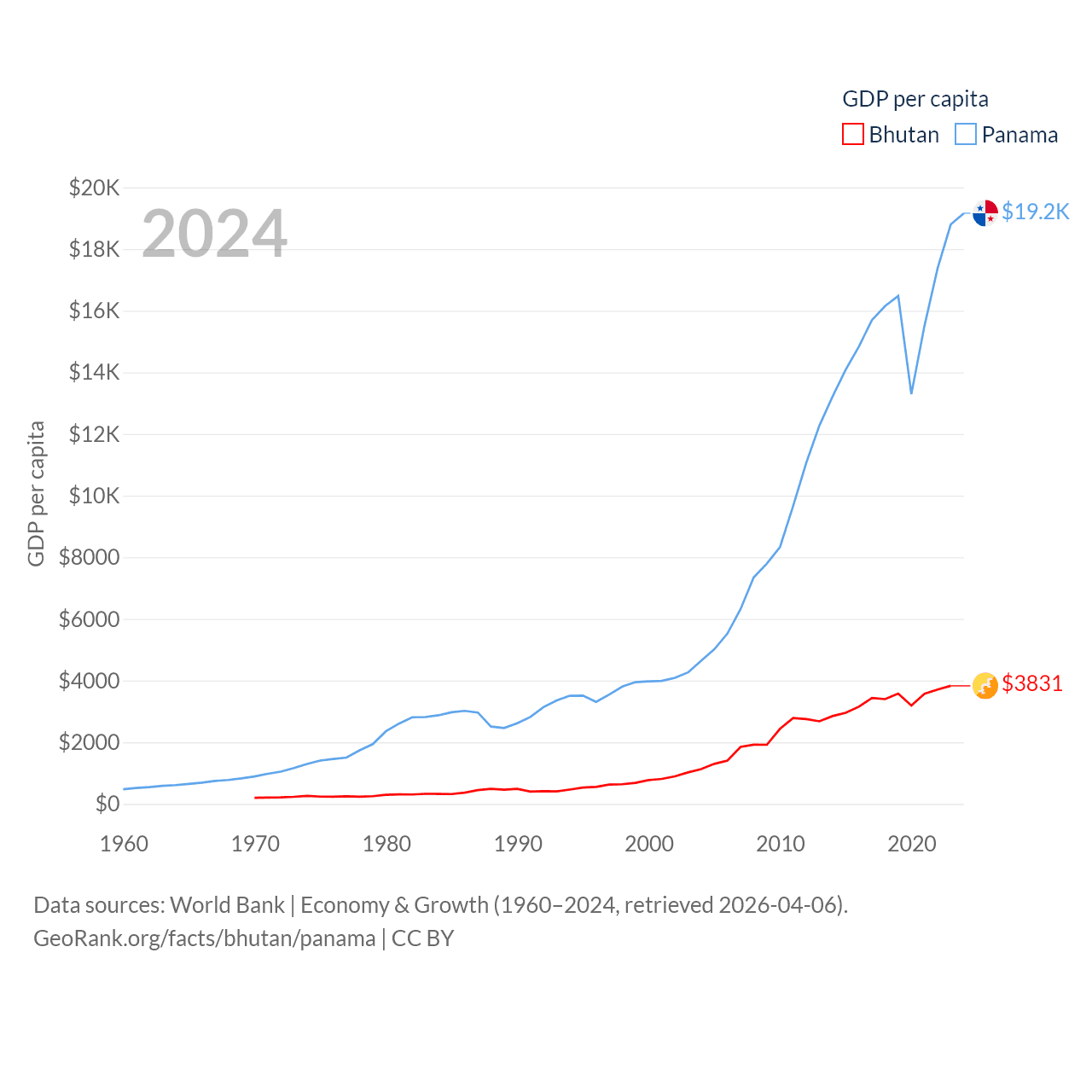 By GDP, Bhutan ranks 170/197 ($3.01B) and Panama ranks 78/197 ($86.5B). By GDP per capita, Bhutan ranks 132/197 ($3,831), while Panama ranks 60/197 ($19,161).