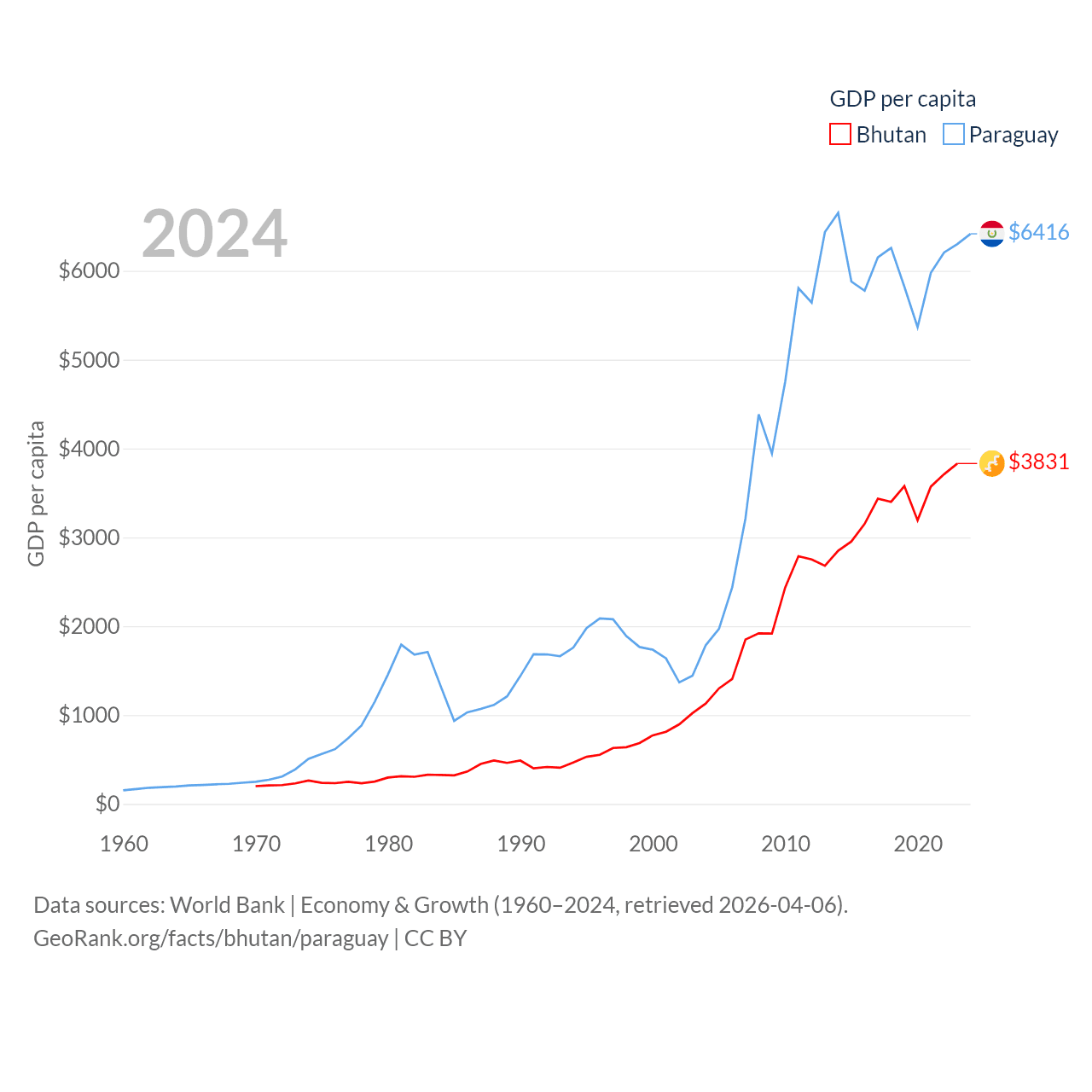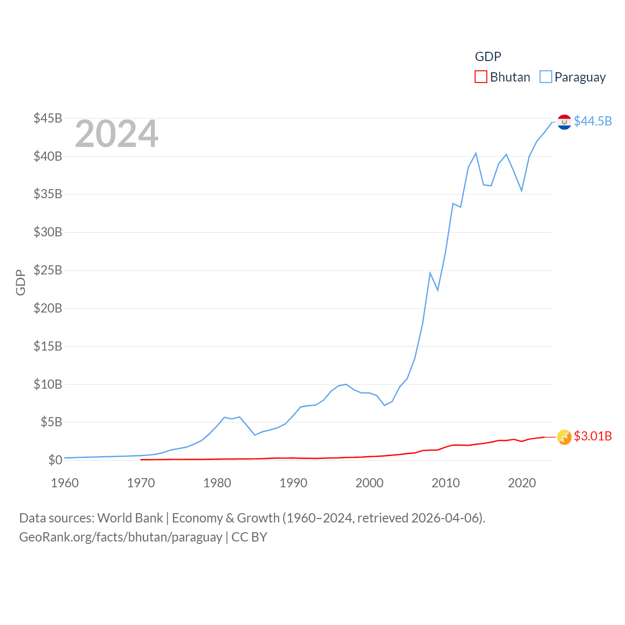 By GDP, Bhutan ranks 170/197 ($3.01B) and Paraguay ranks 98/197 ($44.5B). By GDP per capita, Bhutan ranks 132/197 ($3,831), while Paraguay ranks 109/197 ($6,416).