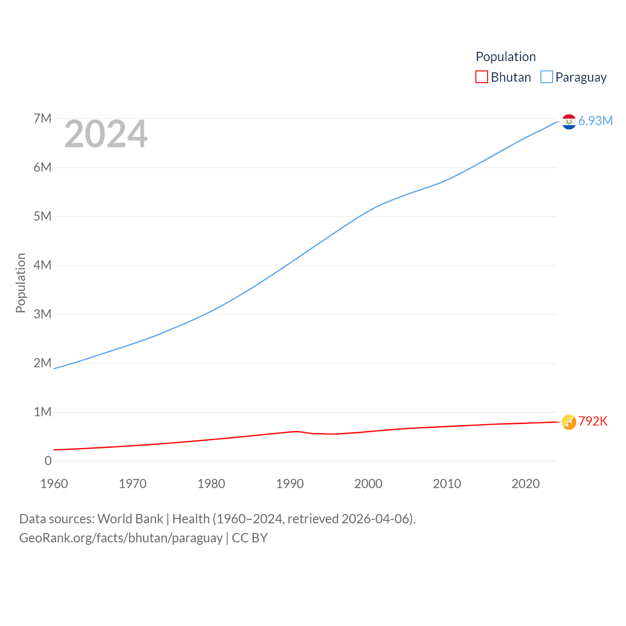 Bhutan has a population of 792K (ranked 163/197), compared with 6.93M in Paraguay (ranked 107/197). Bhutan's land area is 14,726 sq mi versus 152,901 sq mi for Paraguay (ranked 132nd vs. 59th).
