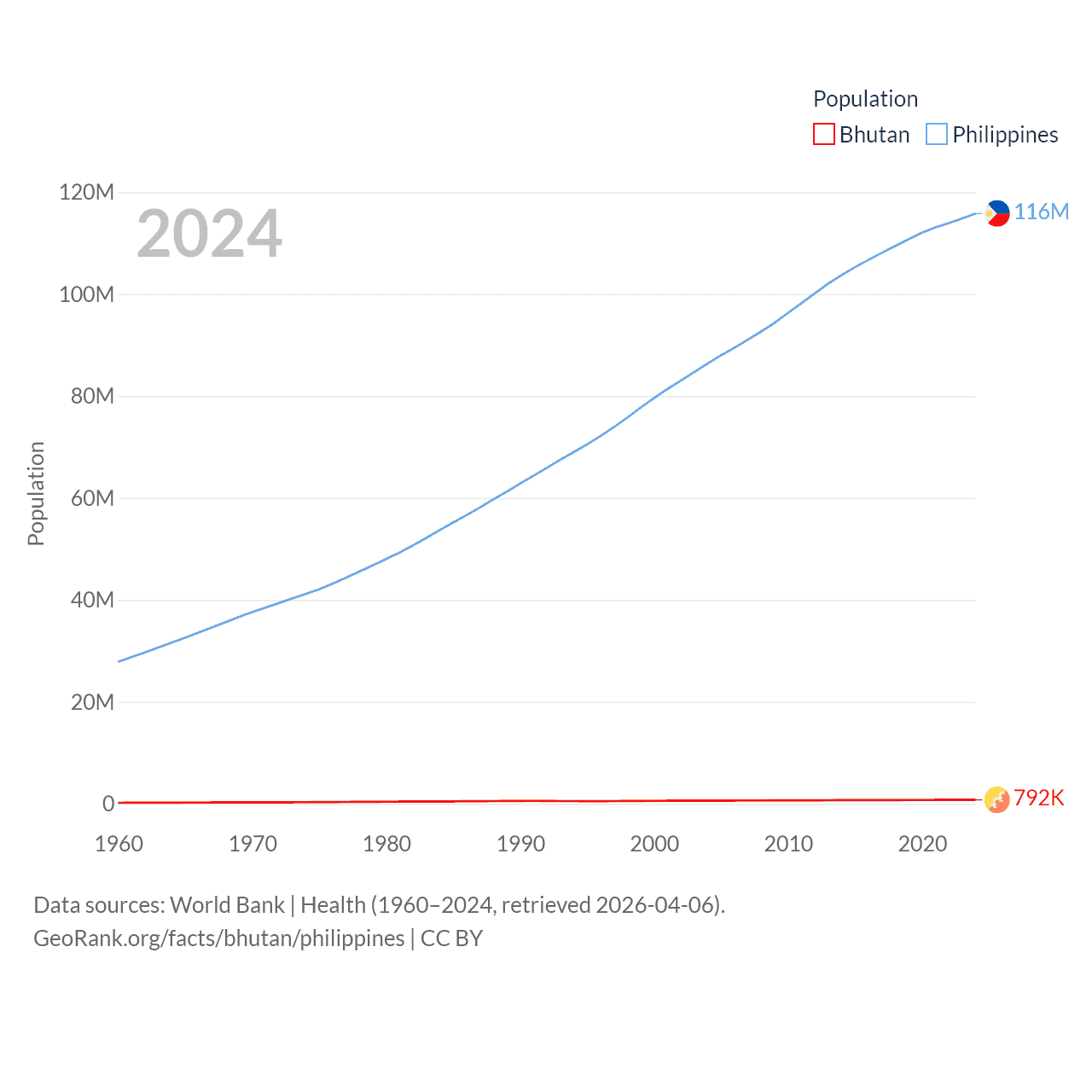 Bhutan has a population of 792K (ranked 163/197), compared with 116M in The Philippines (ranked 14/197). Bhutan's land area is 14,726 sq mi versus 115,124 sq mi for The Philippines (ranked 132nd vs. 71st).