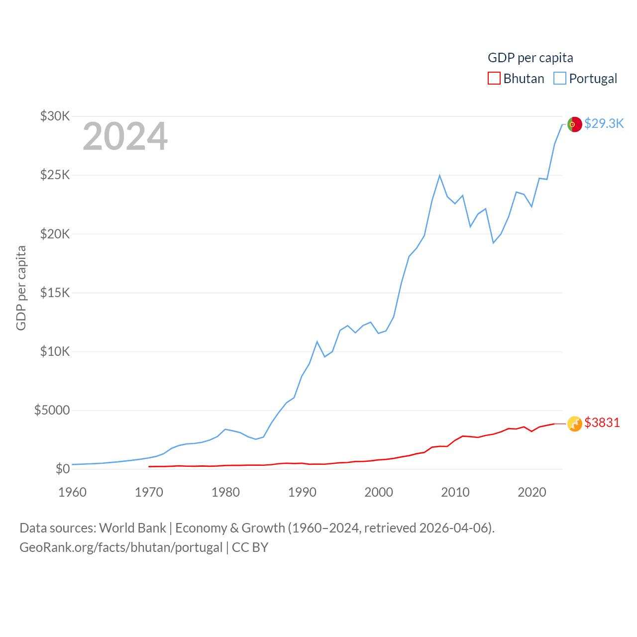 By GDP, Bhutan ranks 170/197 ($3.01B) and Portugal ranks 46/197 ($313B). By GDP per capita, Bhutan ranks 132/197 ($3,831), while Portugal ranks 44/197 ($29,292).