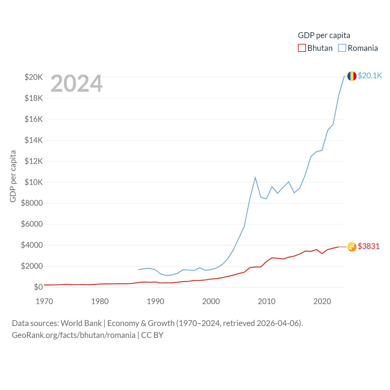 By GDP, Bhutan ranks 170/197 ($3.01B) and Romania ranks 42/197 ($383B). By GDP per capita, Bhutan ranks 132/197 ($3,831), while Romania ranks 58/197 ($20,080).