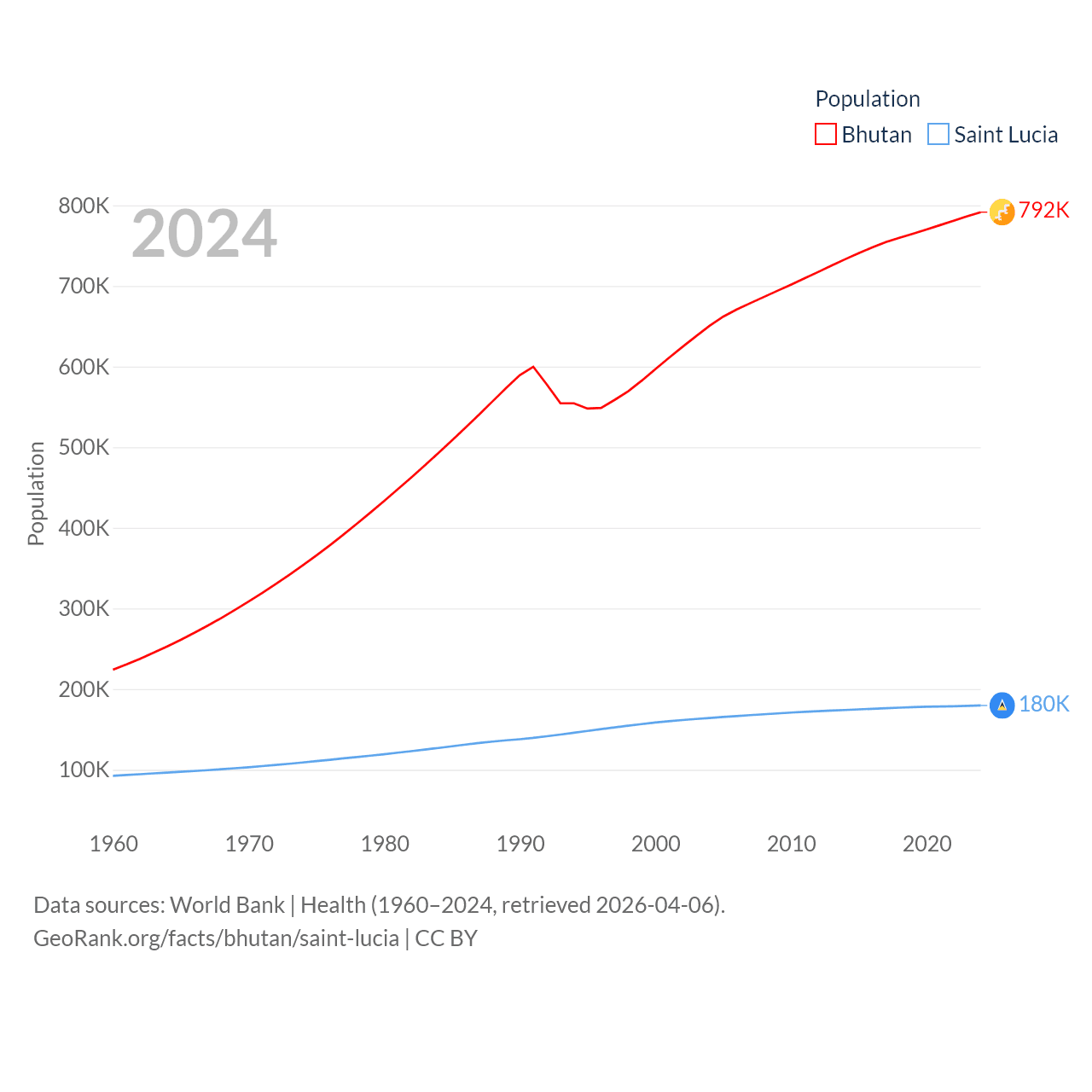 Bhutan has a population of 792K (ranked 163/197), compared with 180K in Saint Lucia (ranked 178/197). Bhutan's land area is 14,726 sq mi versus 235.5 sq mi for Saint Lucia (ranked 132nd vs. 178th).