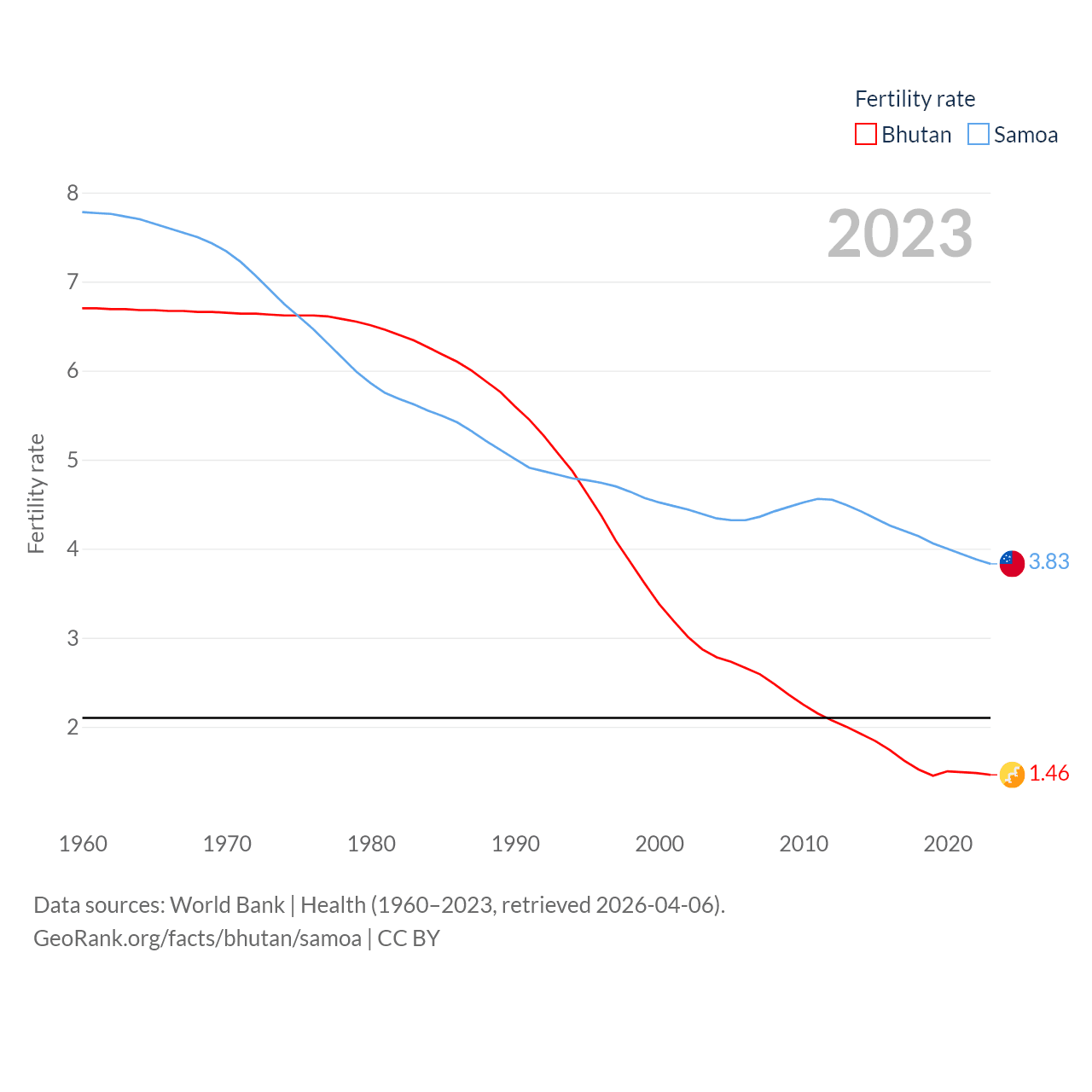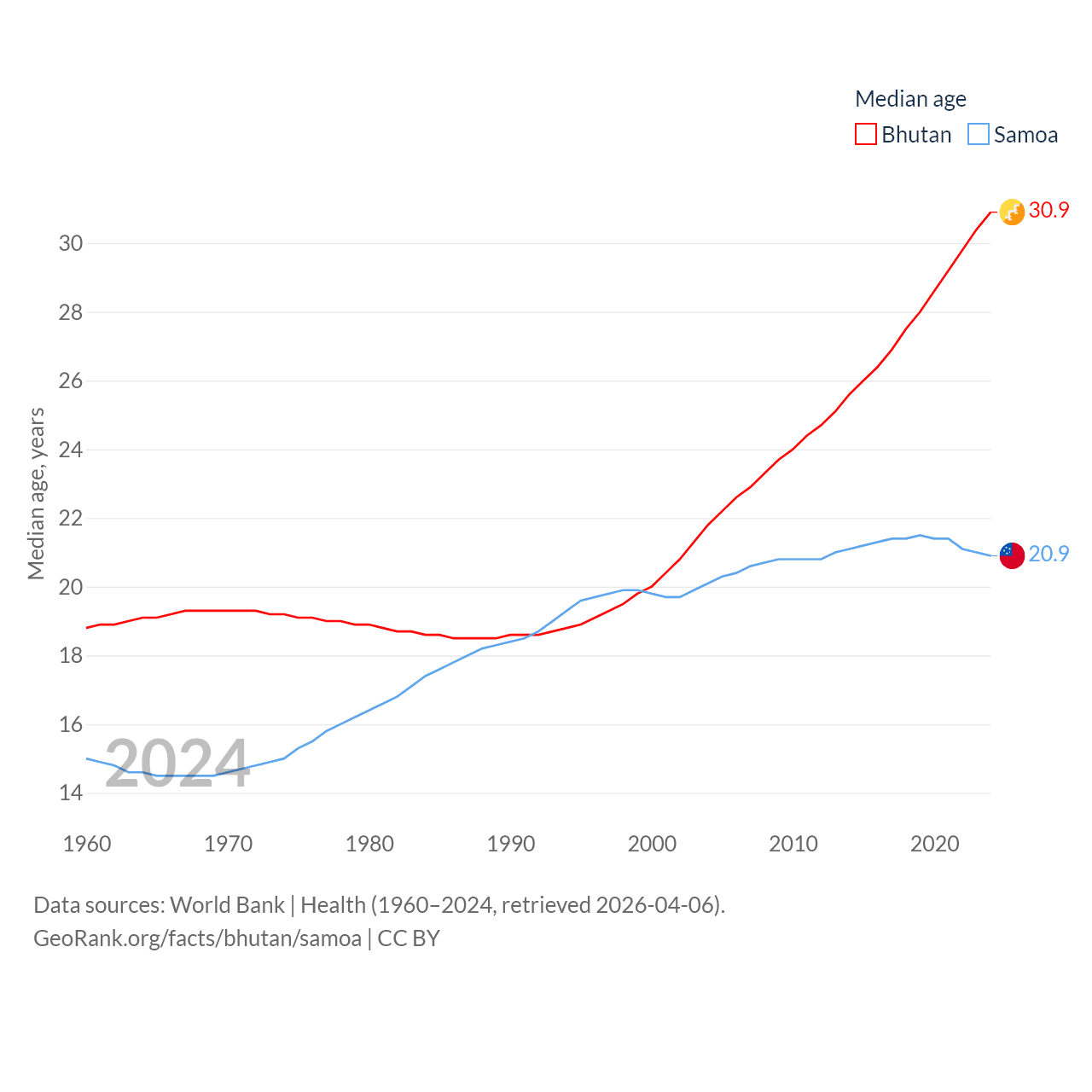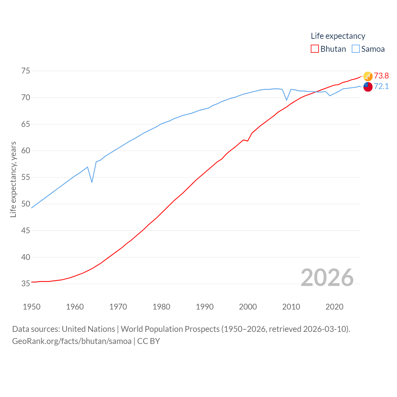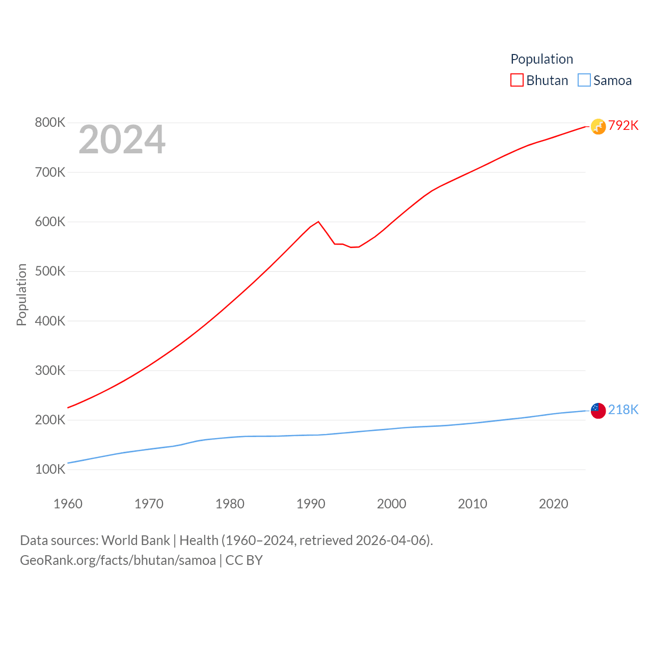 Bhutan has a population of 792K (ranked 163/197), compared with 218K in Samoa (ranked 177/197). Bhutan's land area is 14,726 sq mi versus 1,073 sq mi for Samoa (ranked 132nd vs. 168th).