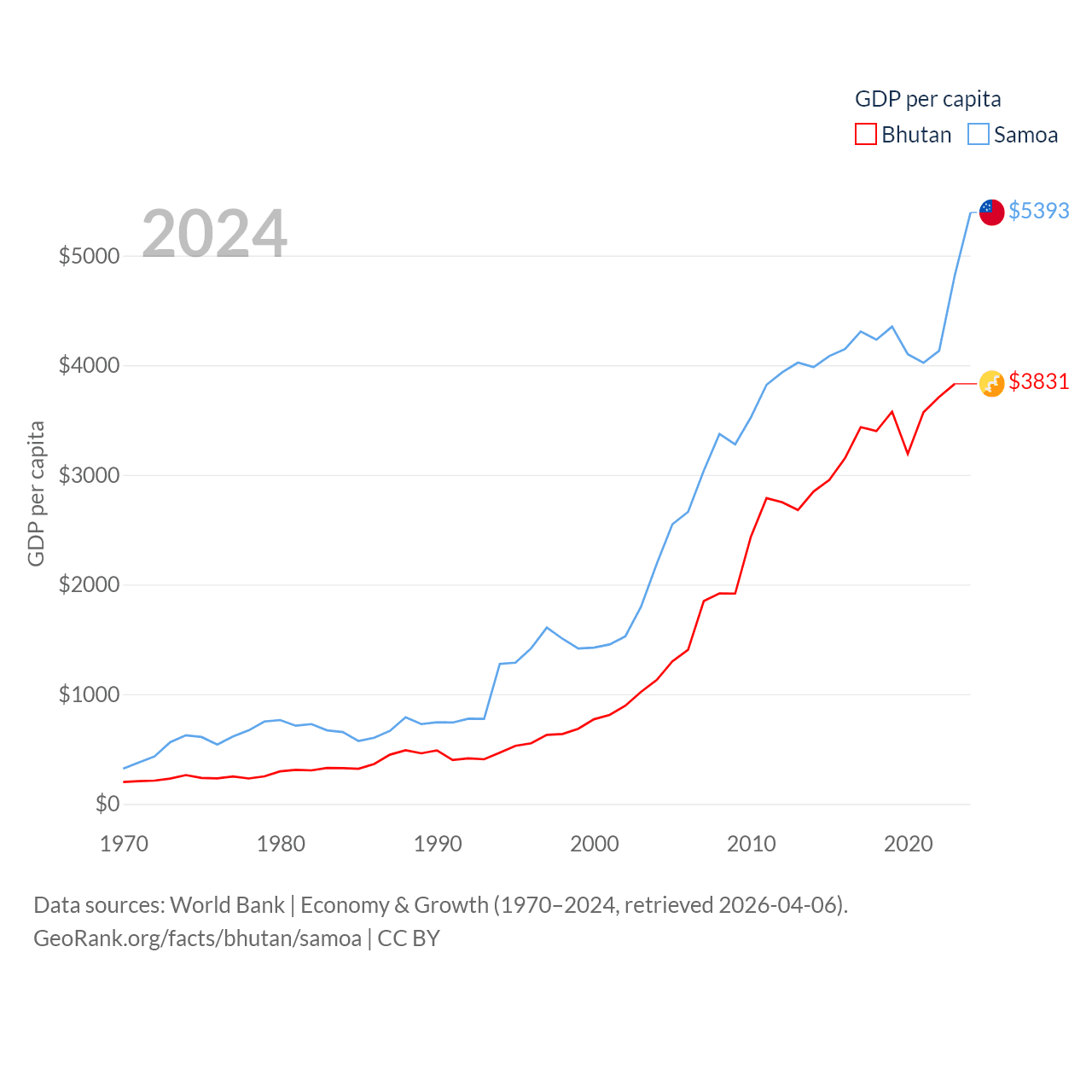 By GDP, Bhutan ranks 170/197 ($3.01B) and Samoa ranks 185/197 ($1.18B). By GDP per capita, Bhutan ranks 132/197 ($3,831), while Samoa ranks 117/197 ($5,393).