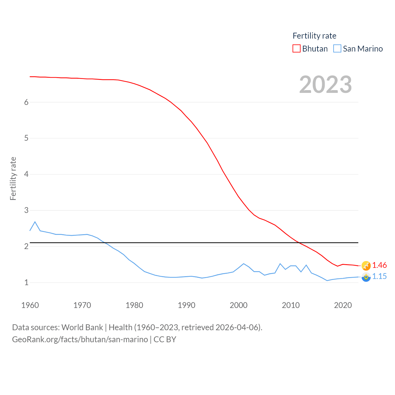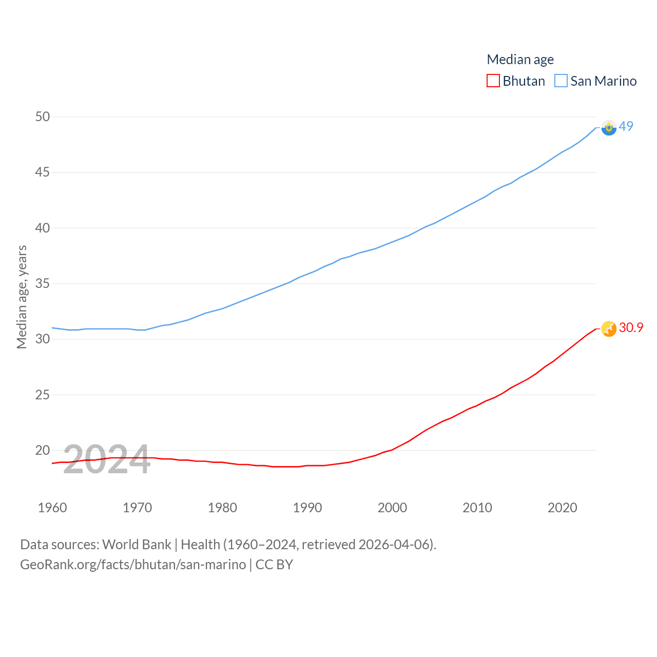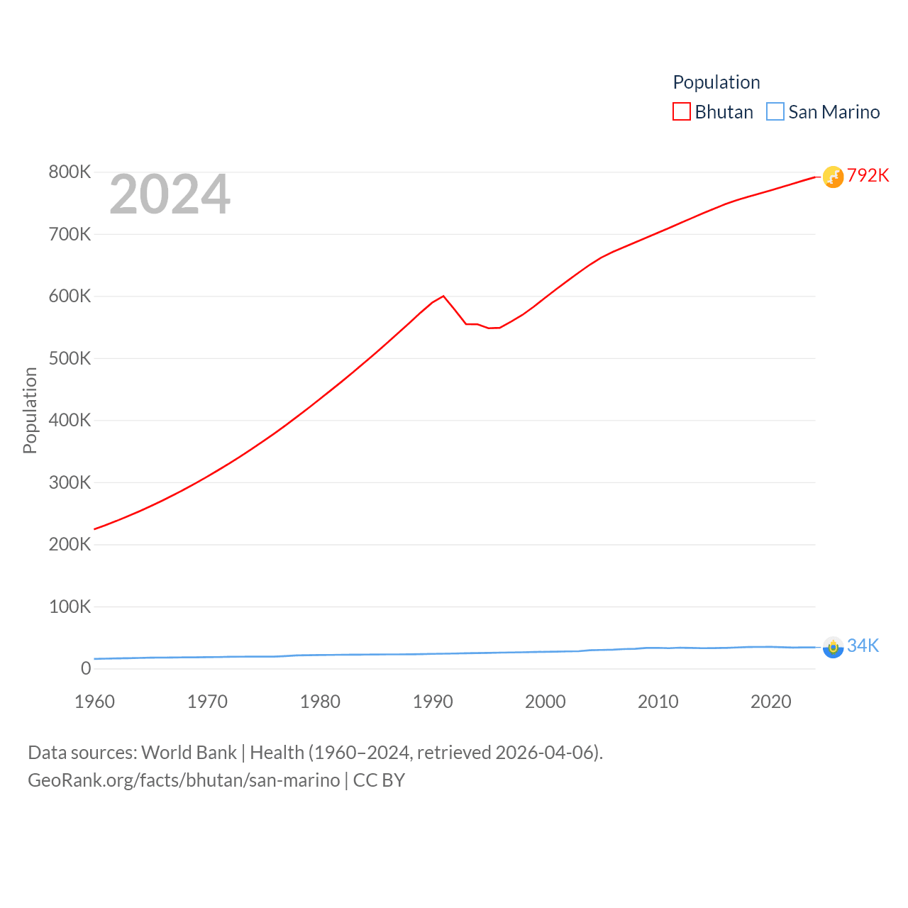Bhutan has a population of 792K (ranked 163/197), compared with 34K in San Marino (ranked 193/197). Bhutan's land area is 14,726 sq mi versus 23.2 sq mi for San Marino (ranked 132nd vs. 193rd).