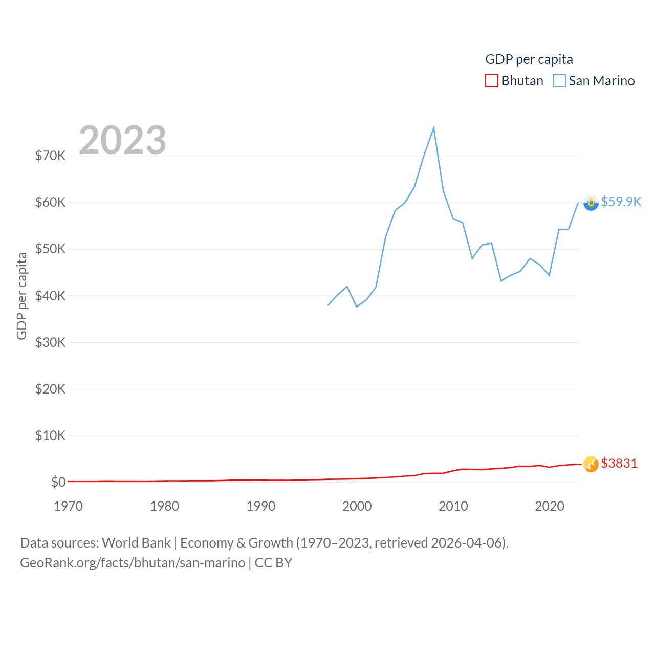 By GDP, Bhutan ranks 170/197 ($3.01B) and San Marino ranks 180/197 ($2.03B). By GDP per capita, Bhutan ranks 132/197 ($3,831), while San Marino ranks 15/197 ($59,880).