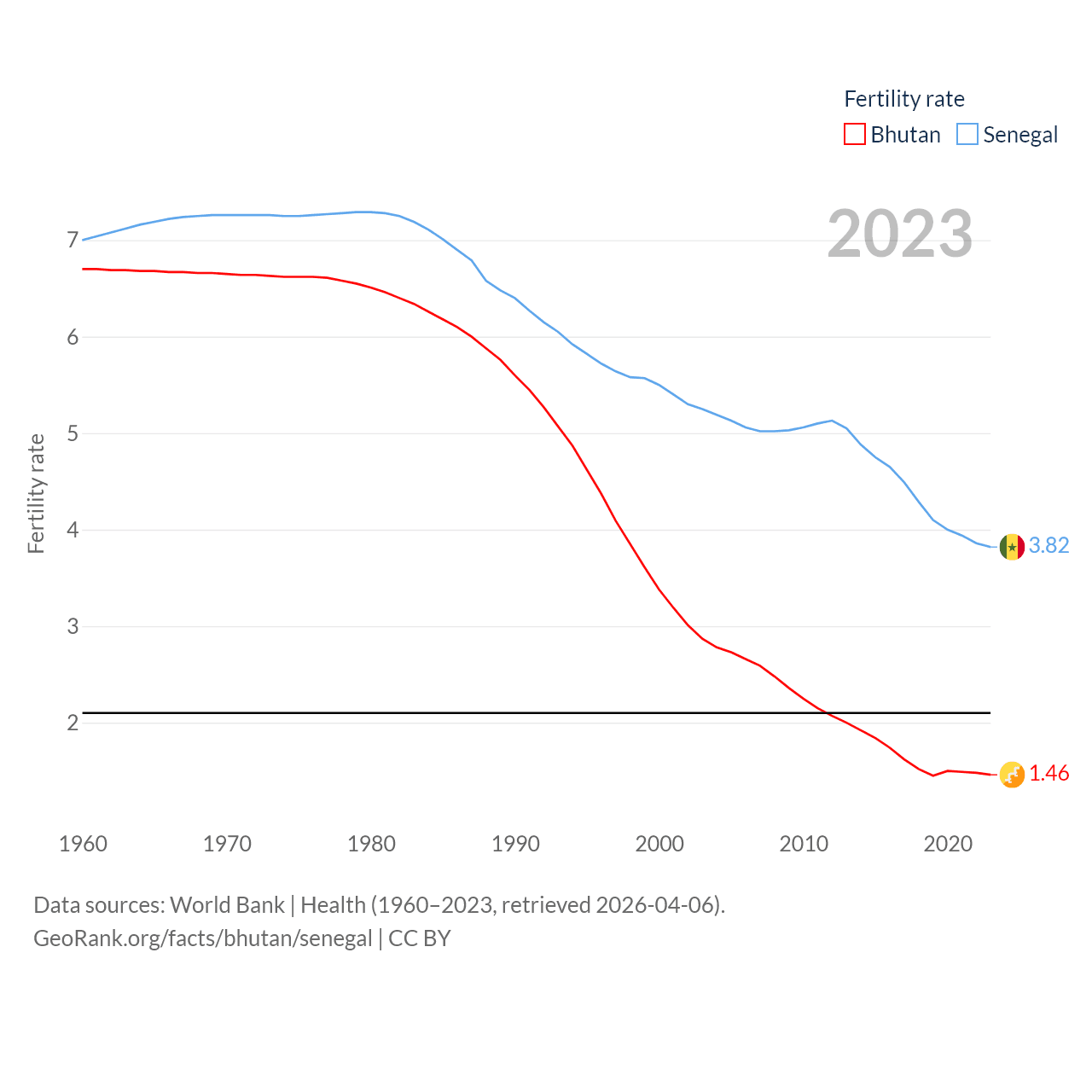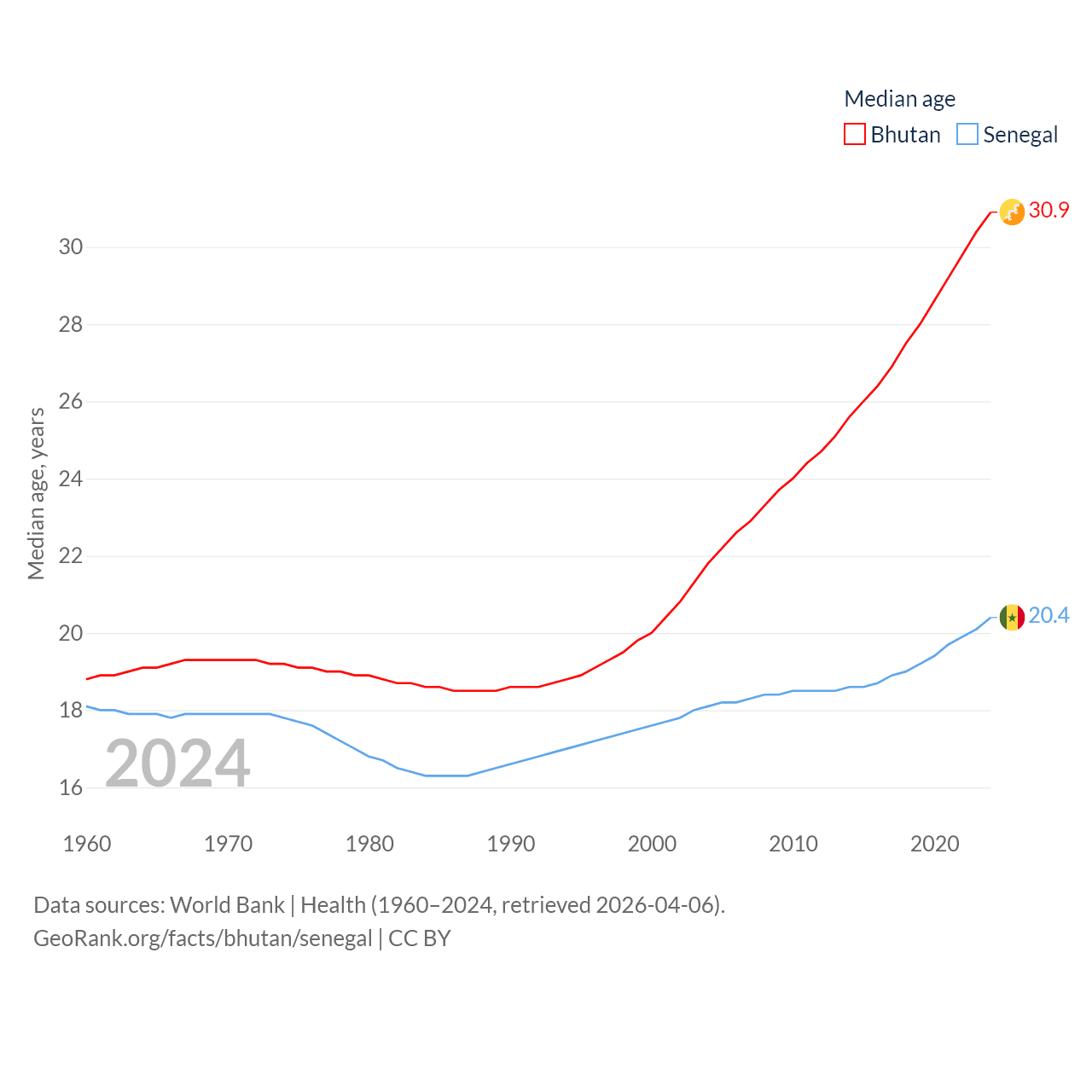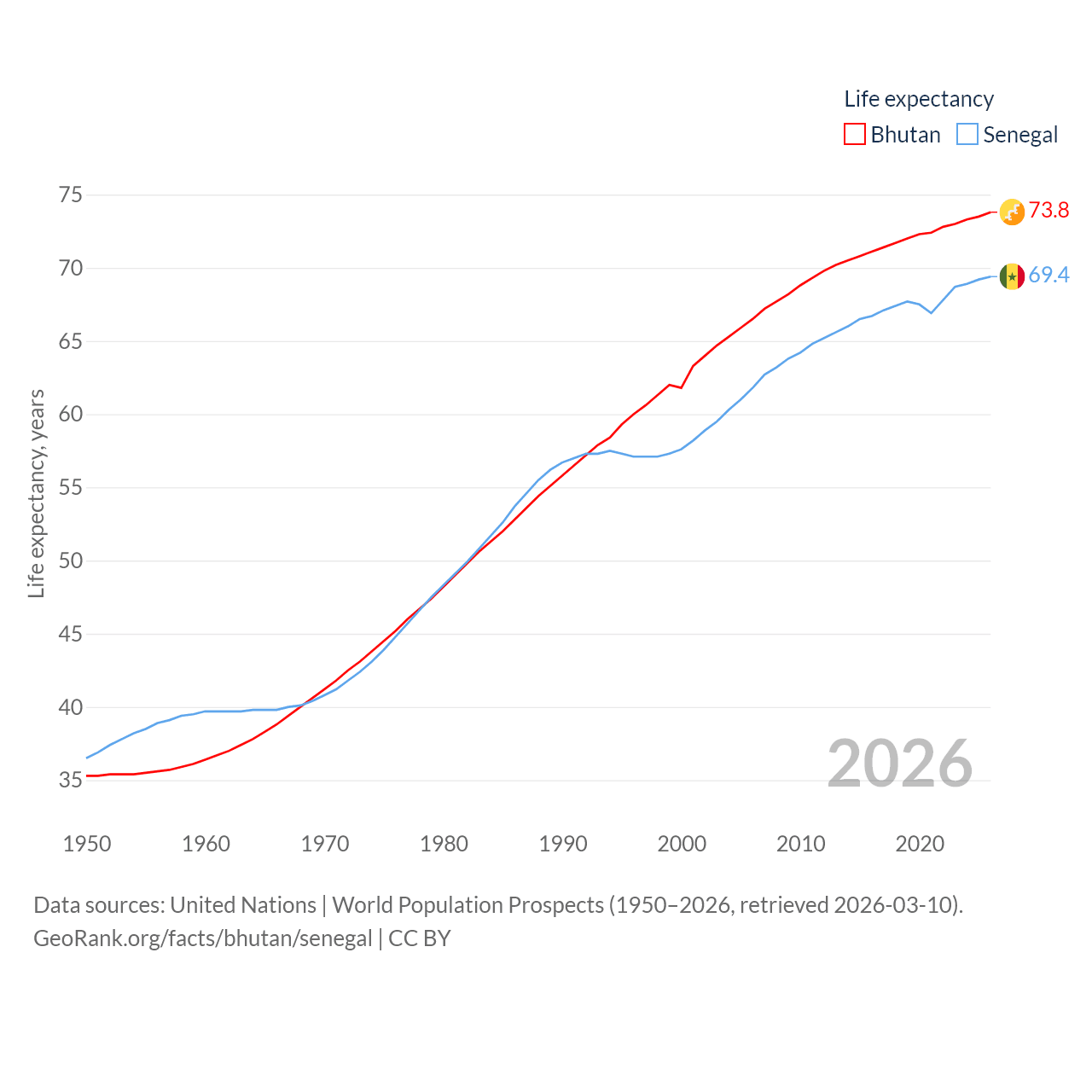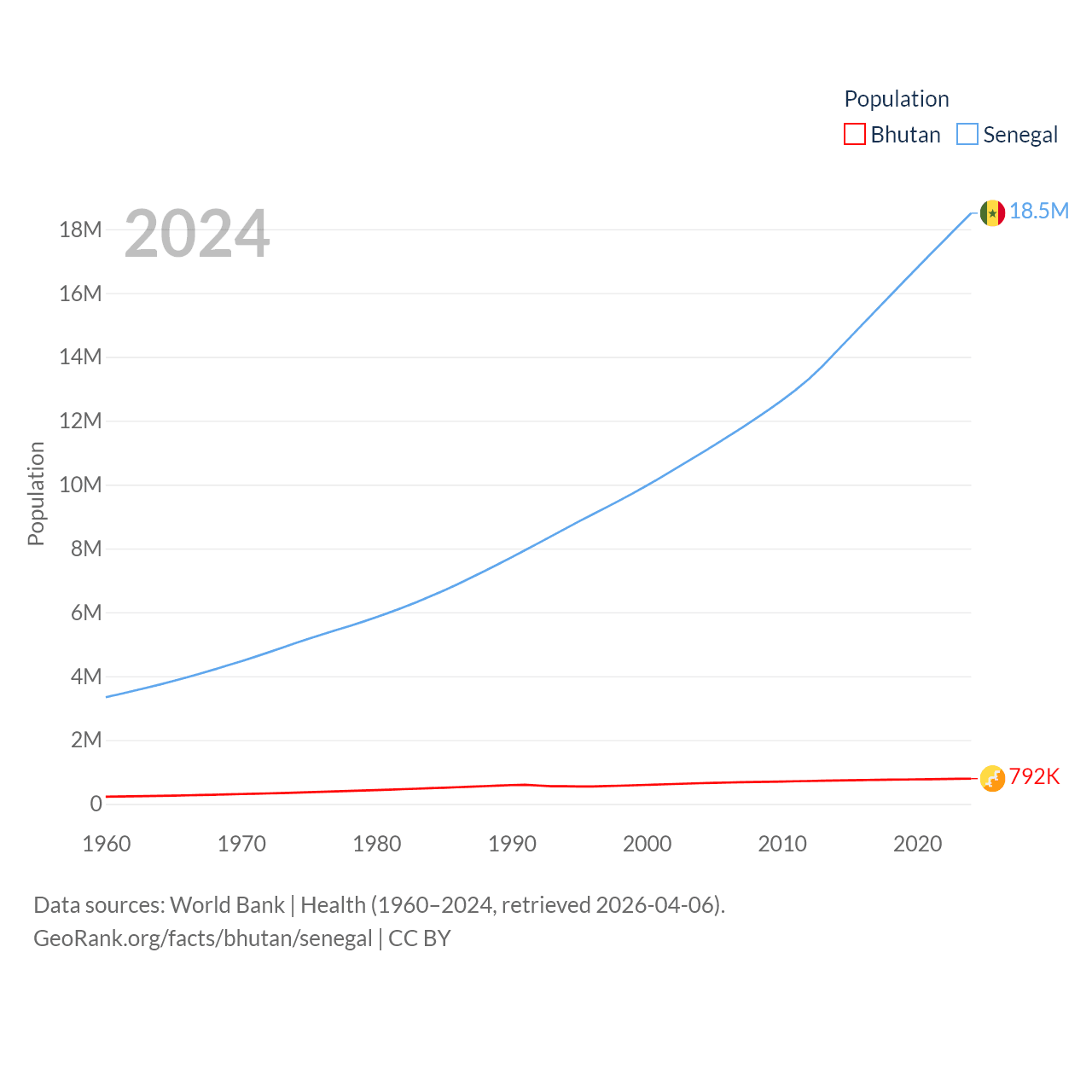 Bhutan has a population of 792K (ranked 163/197), compared with 18.5M in Senegal (ranked 69/197). Bhutan's land area is 14,726 sq mi versus 74,336 sq mi for Senegal (ranked 132nd vs. 85th).