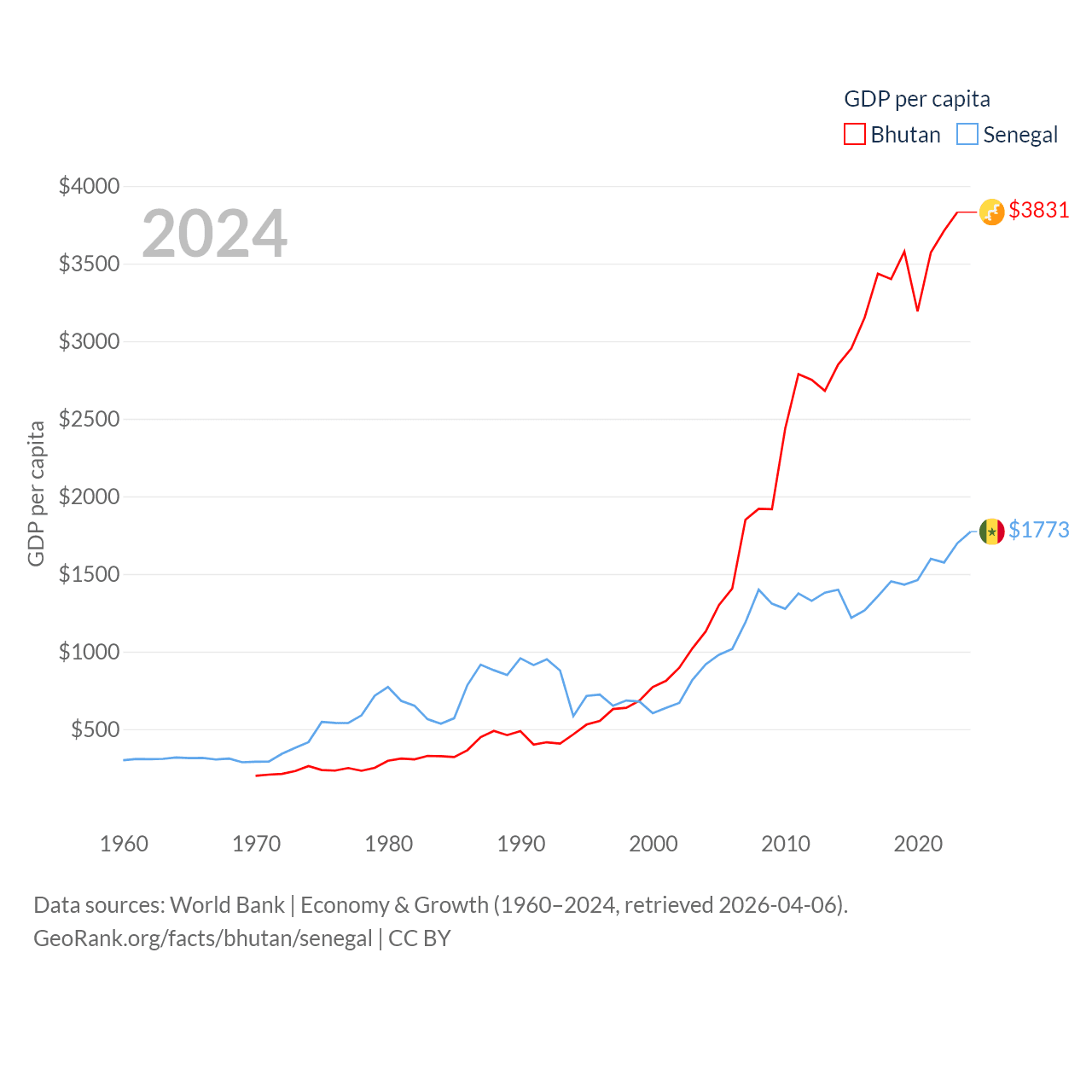 By GDP, Bhutan ranks 170/197 ($3.01B) and Senegal ranks 109/197 ($32.8B). By GDP per capita, Bhutan ranks 132/197 ($3,831), while Senegal ranks 159/197 ($1,773).