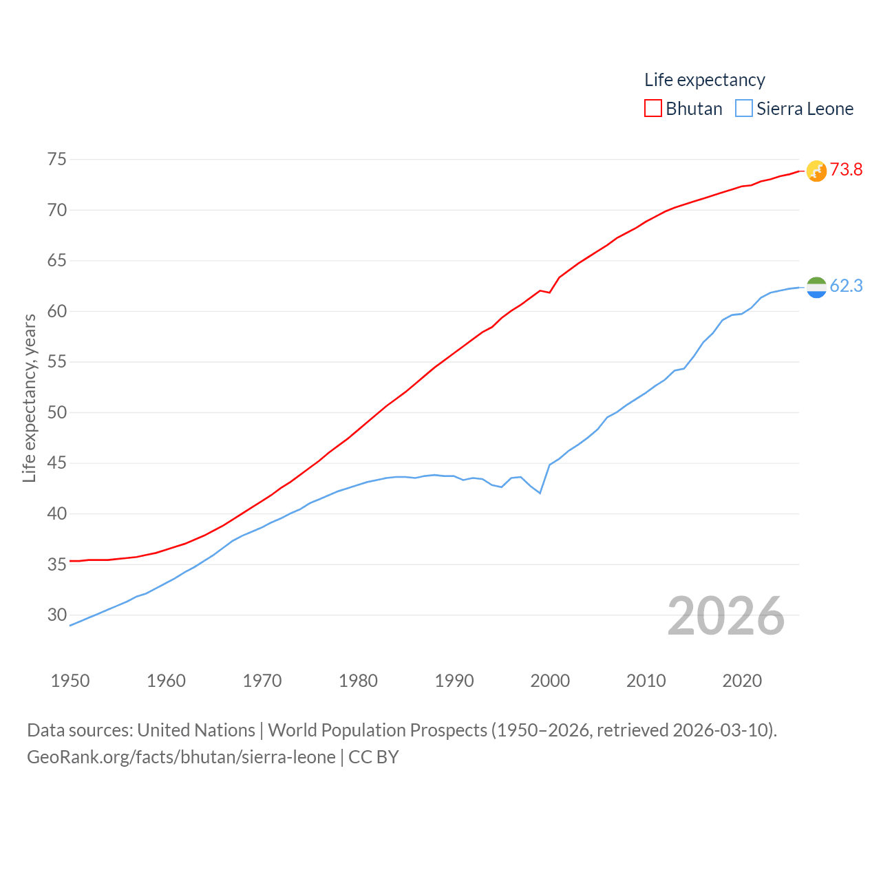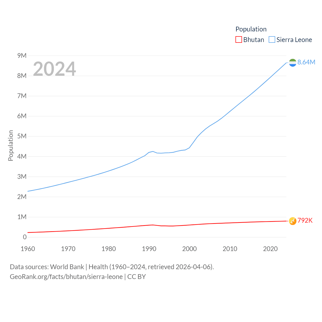 Bhutan has a population of 792K (ranked 163/197), compared with 8.64M in Sierra Leone (ranked 102/197). Bhutan's land area is 14,726 sq mi versus 27,869 sq mi for Sierra Leone (ranked 132nd vs. 116th).