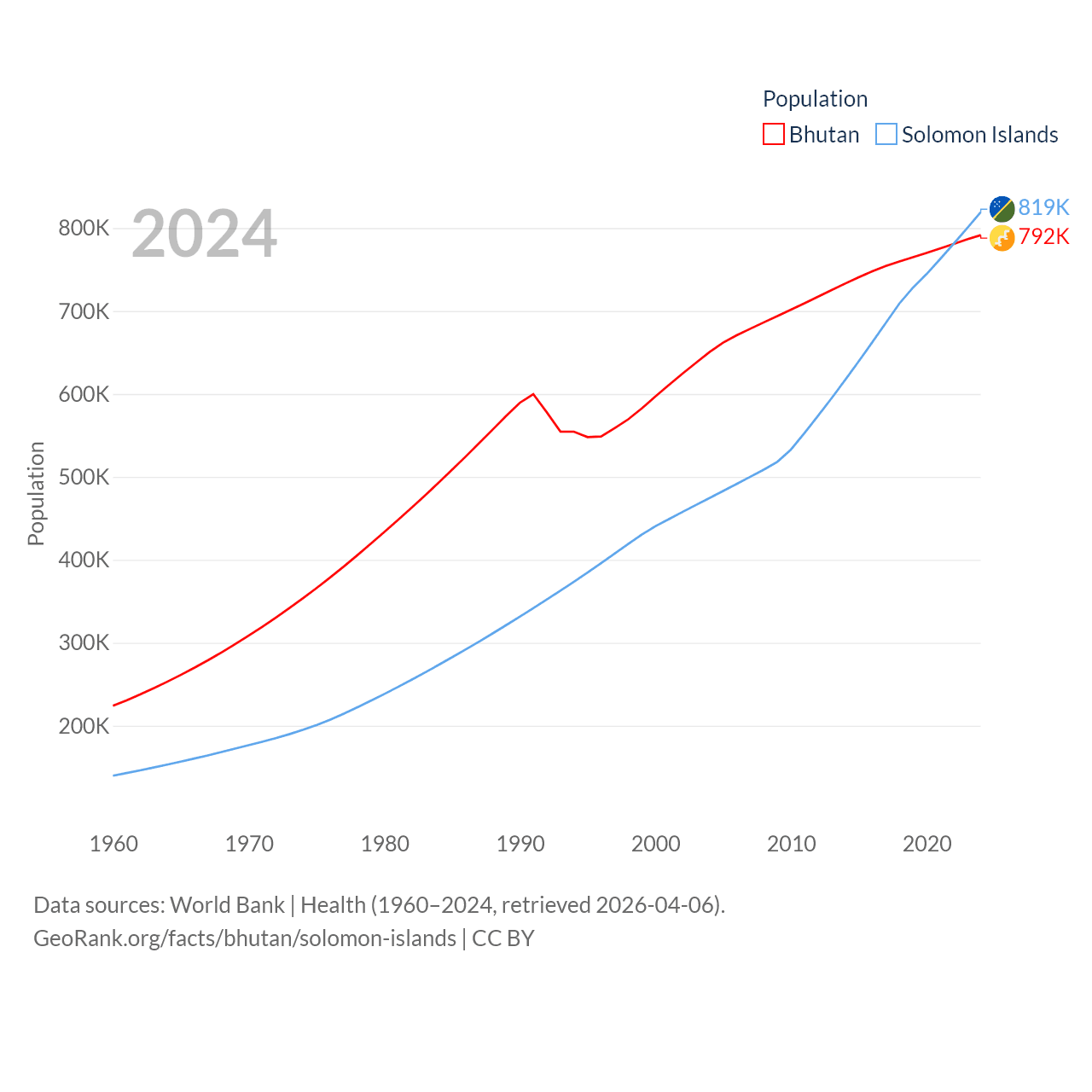 Bhutan has a population of 792K (ranked 163/197), compared with 819K in The Solomon Islands (ranked 162/197). Bhutan's land area is 14,726 sq mi versus 10,807 sq mi for The Solomon Islands (ranked 132nd vs. 141st).