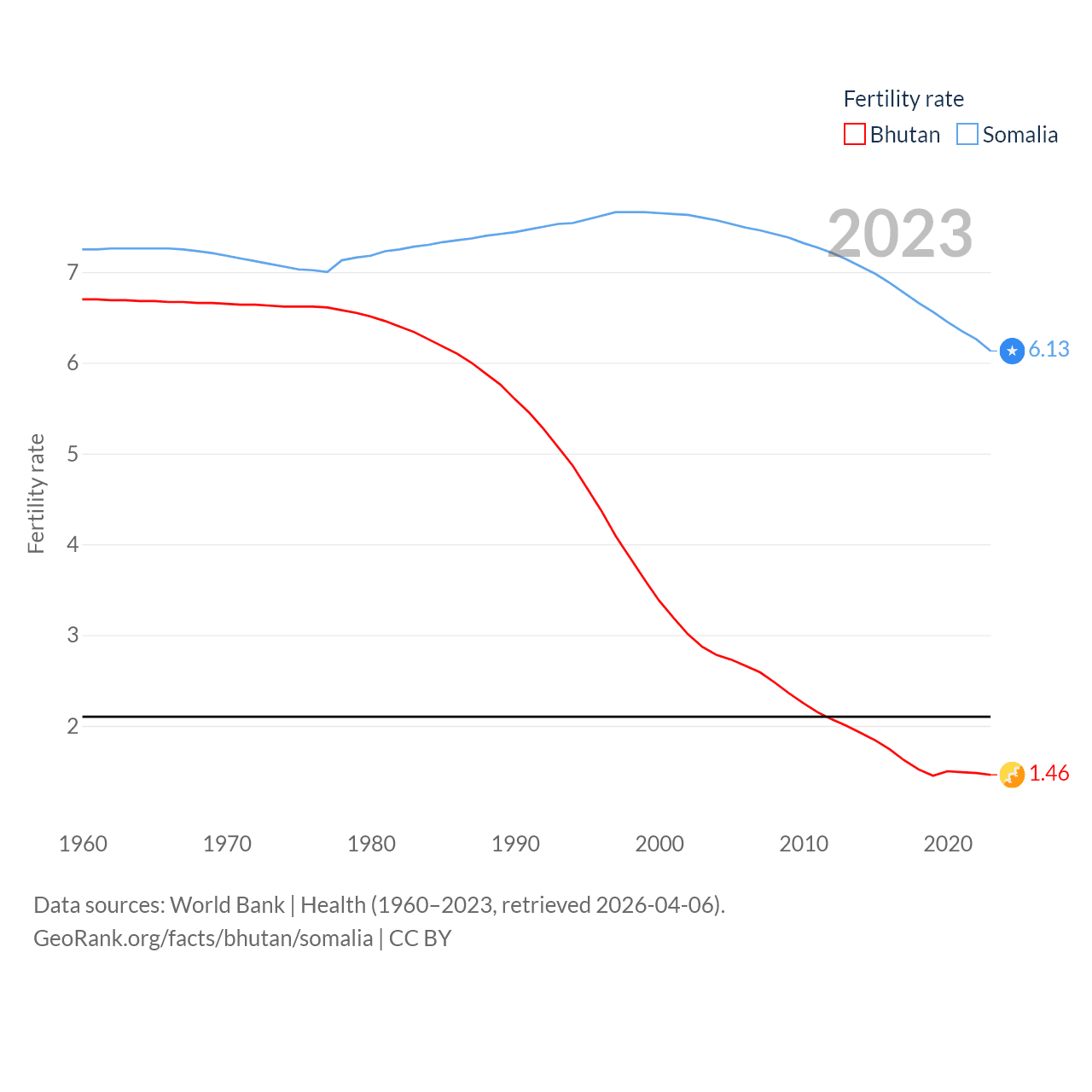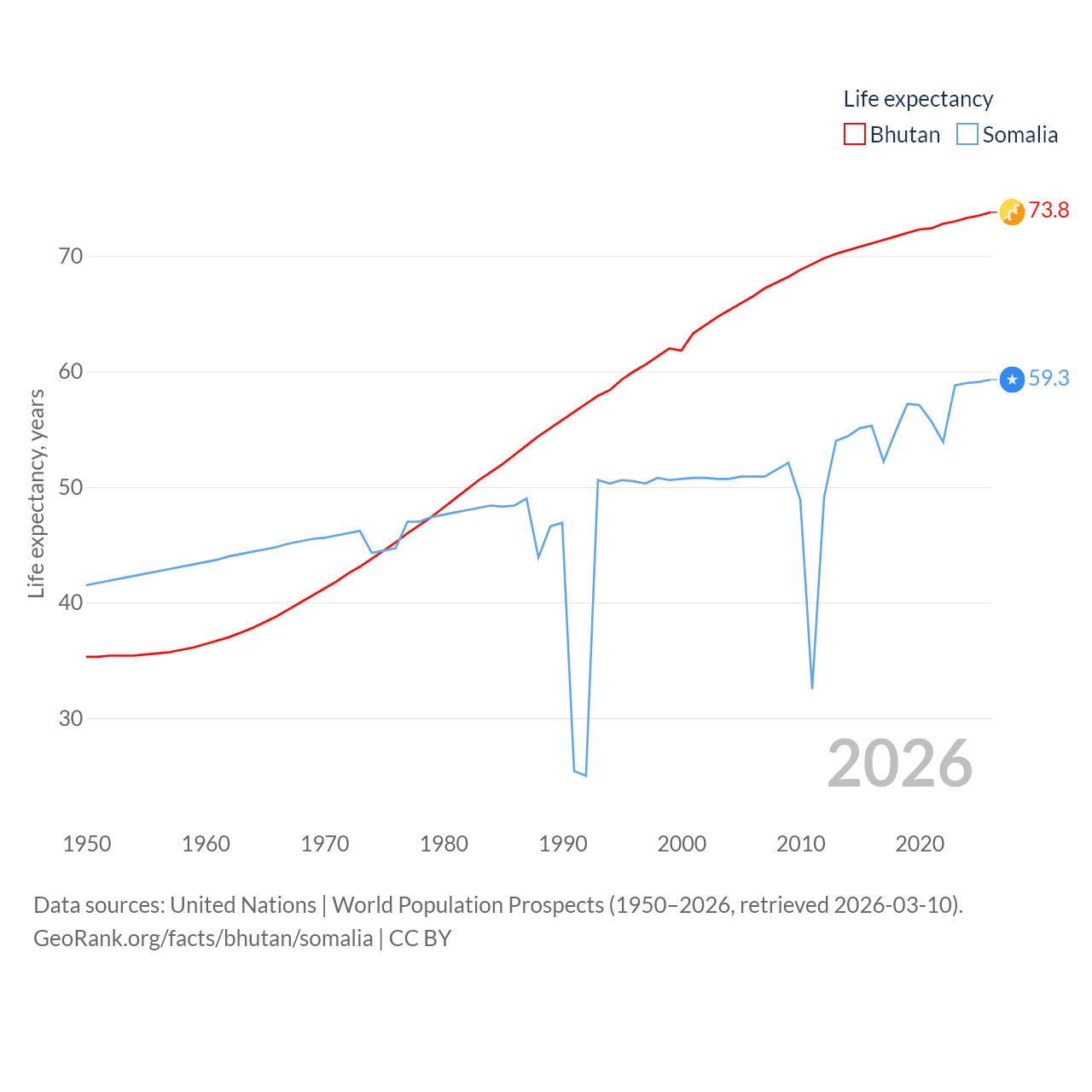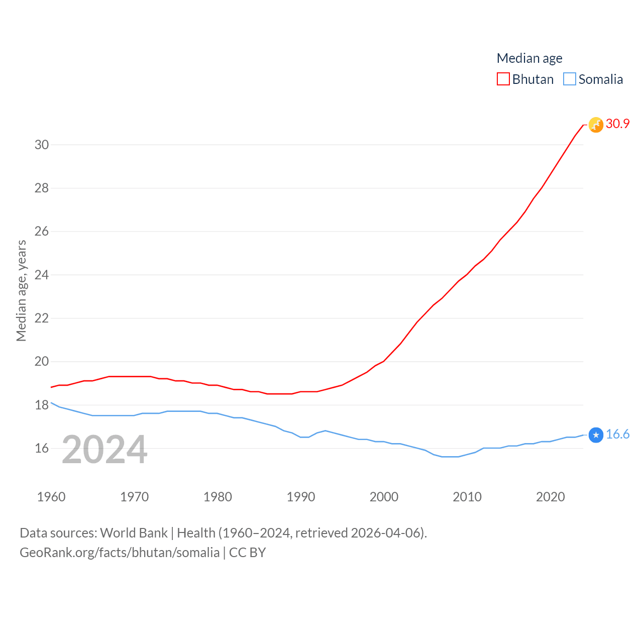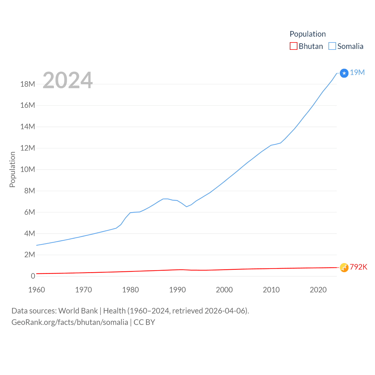 Bhutan has a population of 792K (ranked 163/197), compared with 19M in Somalia (ranked 68/197). Bhutan's land area is 14,726 sq mi versus 242,217 sq mi for Somalia (ranked 132nd vs. 42nd).