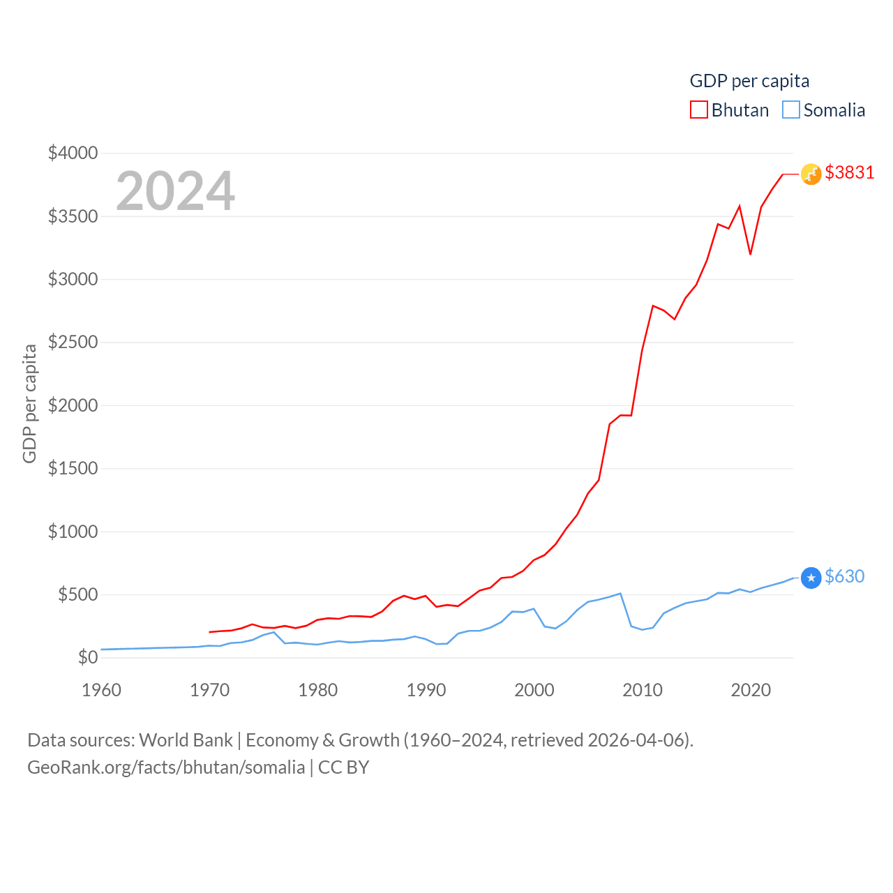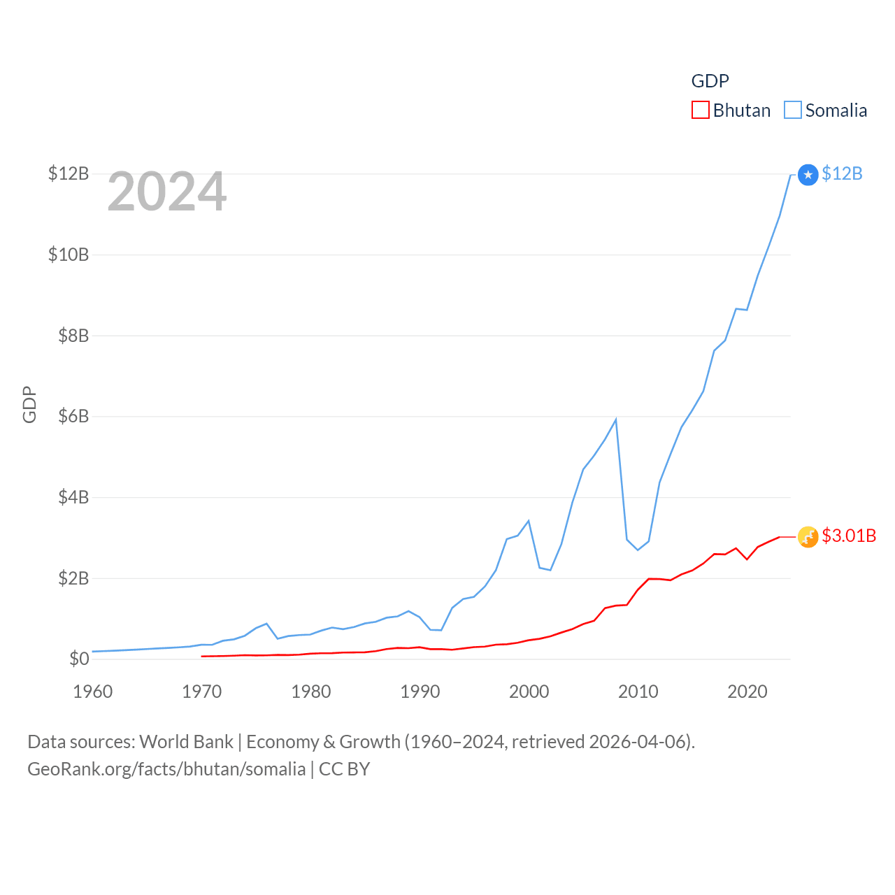 By GDP, Bhutan ranks 170/197 ($3.01B) and Somalia ranks 150/197 ($12B). By GDP per capita, Bhutan ranks 132/197 ($3,831), while Somalia ranks 192/197 ($630).