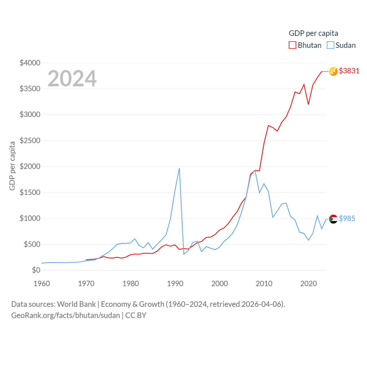By GDP, Bhutan ranks 170/197 ($3.01B) and Sudan ranks 94/197 ($49.7B). By GDP per capita, Bhutan ranks 132/197 ($3,831), while Sudan ranks 179/197 ($985).