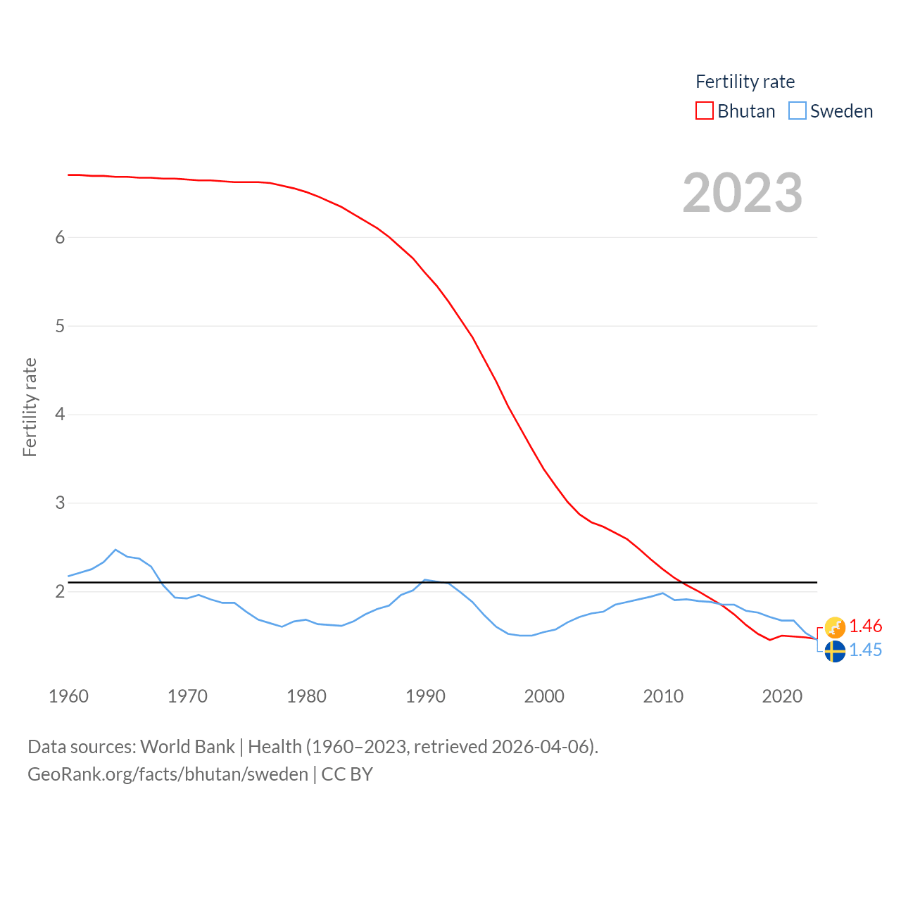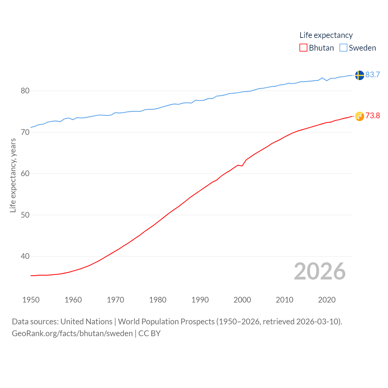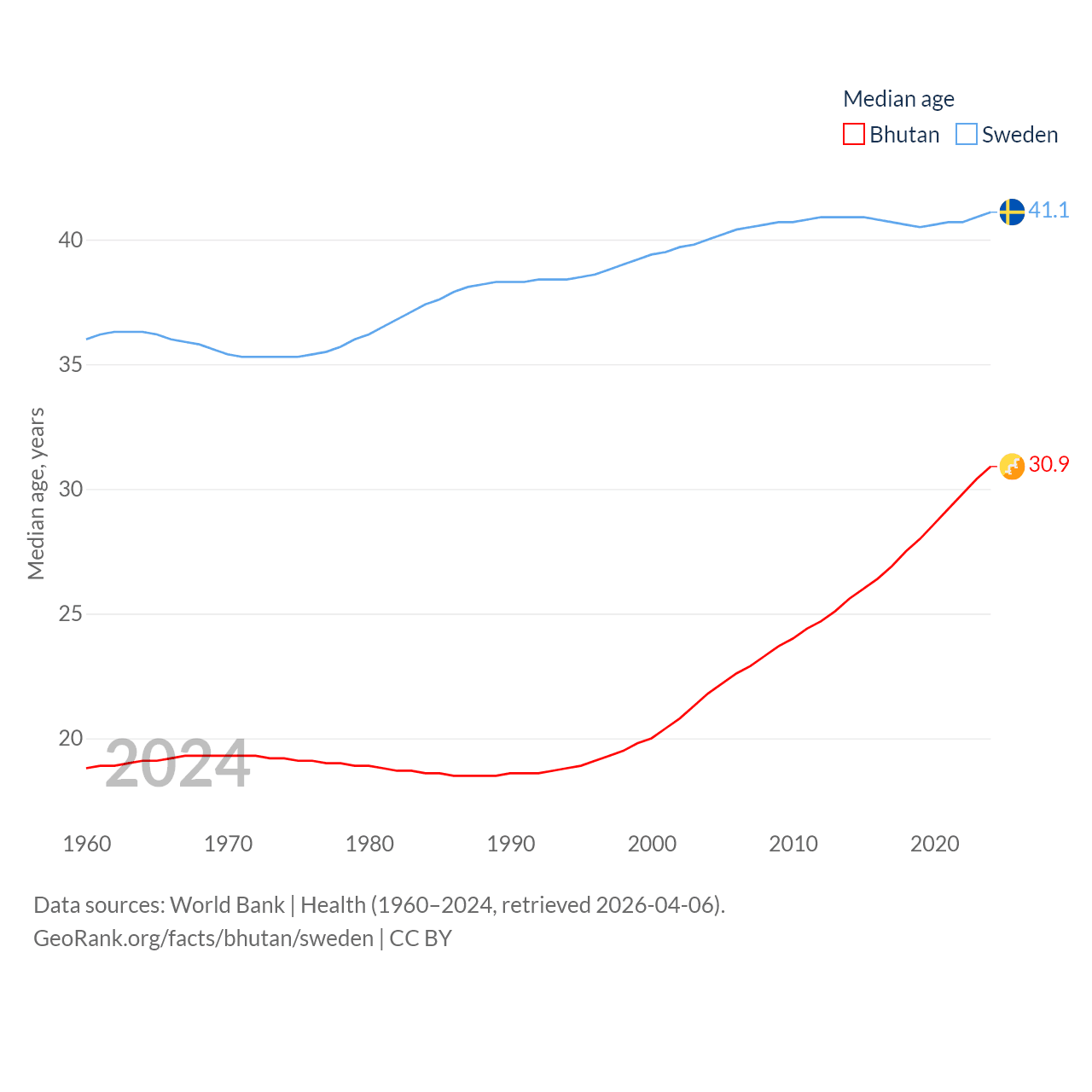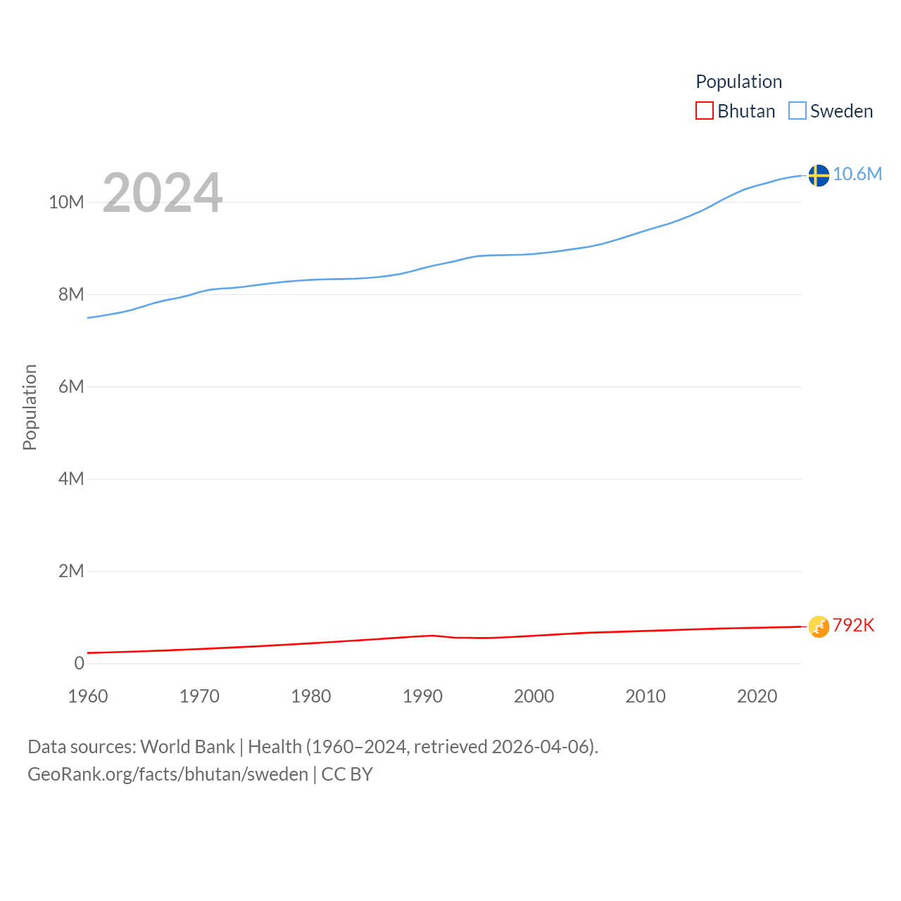Bhutan has a population of 792K (ranked 163/197), compared with 10.6M in Sweden (ranked 93/197). Bhutan's land area is 14,726 sq mi versus 157,248 sq mi for Sweden (ranked 132nd vs. 58th).