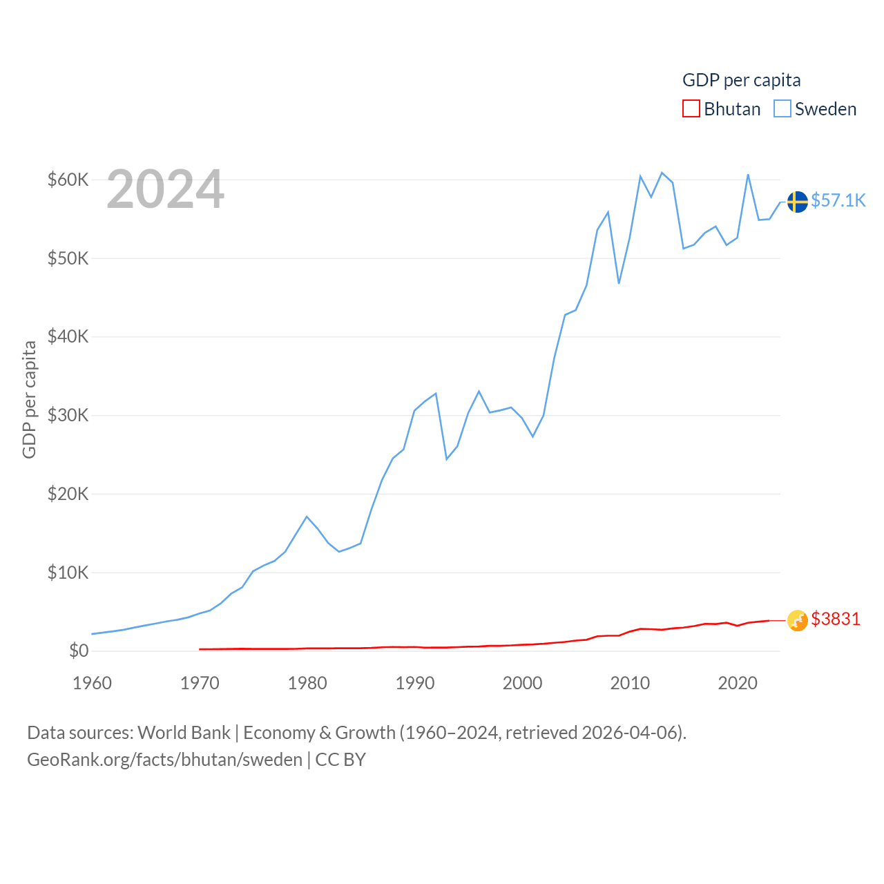 By GDP, Bhutan ranks 170/197 ($3.01B) and Sweden ranks 26/197 ($604B). By GDP per capita, Bhutan ranks 132/197 ($3,831), while Sweden ranks 17/197 ($57,117).