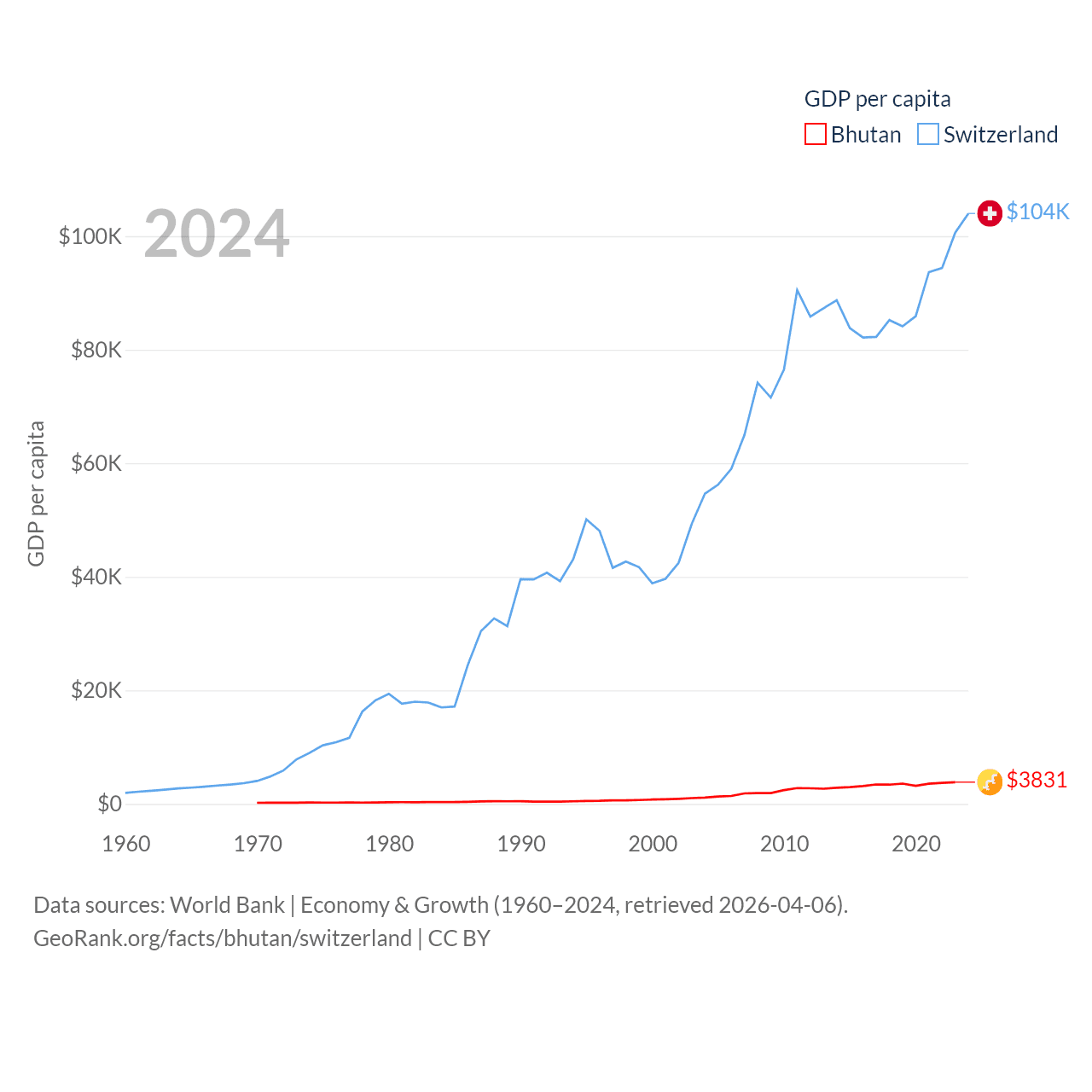 By GDP, Bhutan ranks 170/197 ($3.01B) and Switzerland ranks 20/197 ($937B). By GDP per capita, Bhutan ranks 132/197 ($3,831), while Switzerland ranks 5/197 ($103,998).