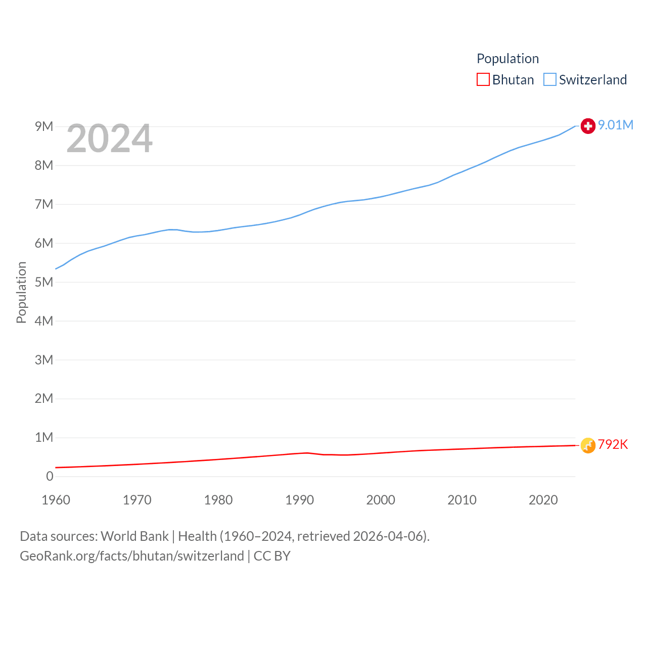 Bhutan has a population of 792K (ranked 163/197), compared with 9.01M in Switzerland (ranked 101/197). Bhutan's land area is 14,726 sq mi versus 15,255 sq mi for Switzerland (ranked 132nd vs. 131st).
