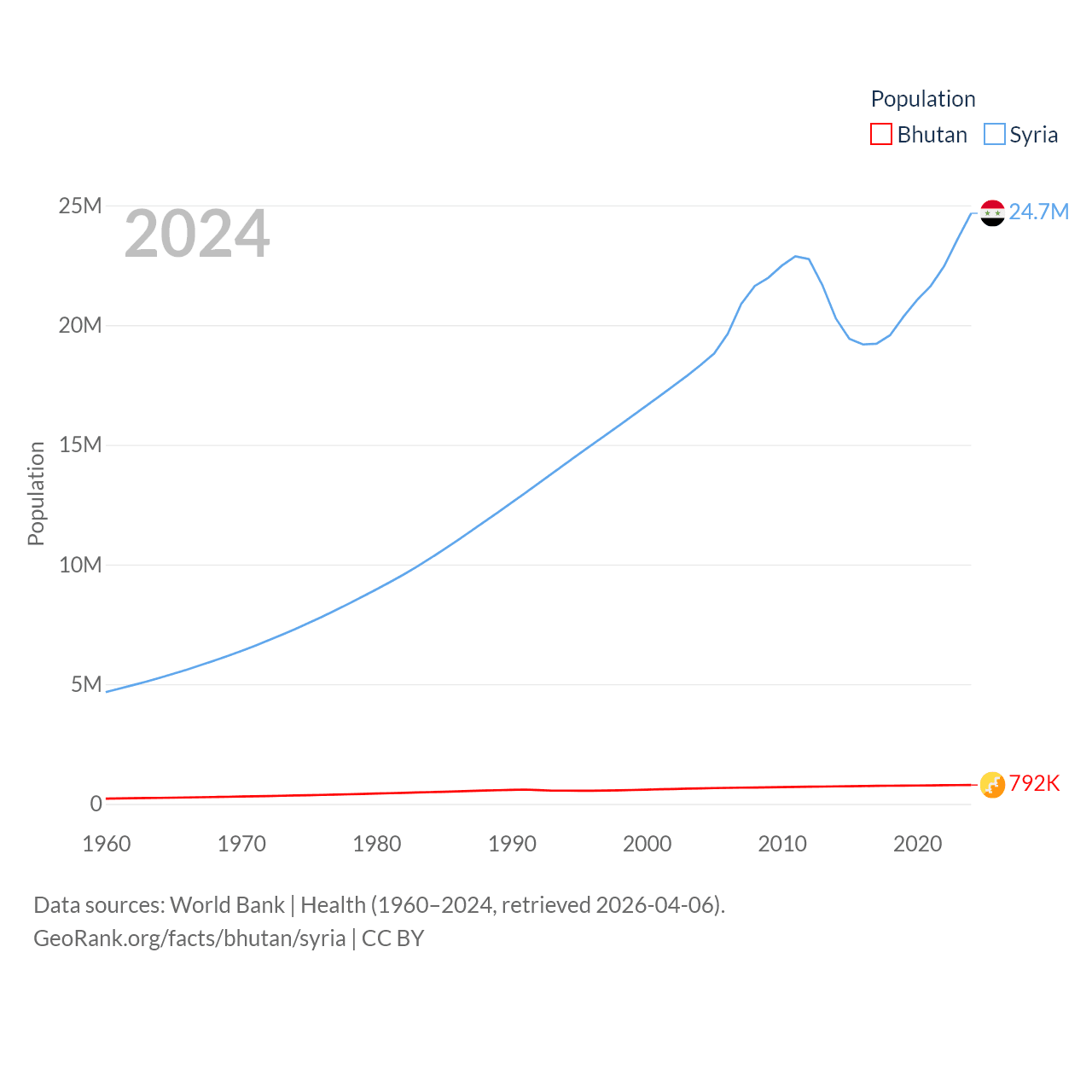 Bhutan has a population of 792K (ranked 163/197), compared with 24.7M in Syria (ranked 57/197). Bhutan's land area is 14,726 sq mi versus 70,900 sq mi for Syria (ranked 132nd vs. 87th).