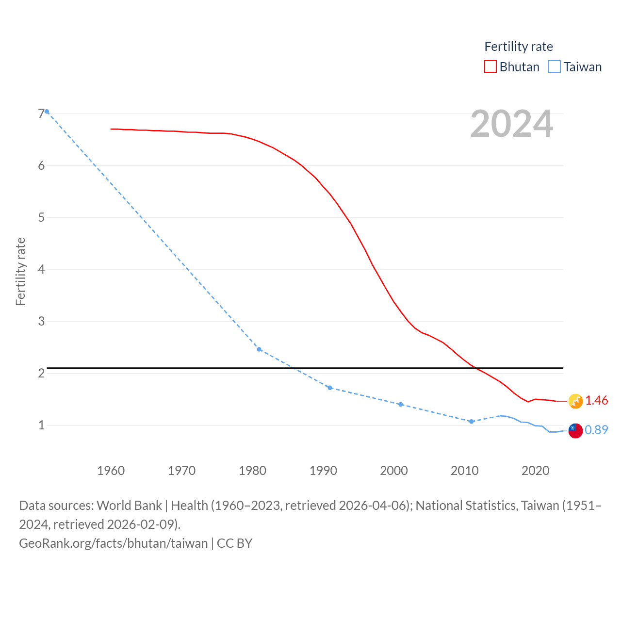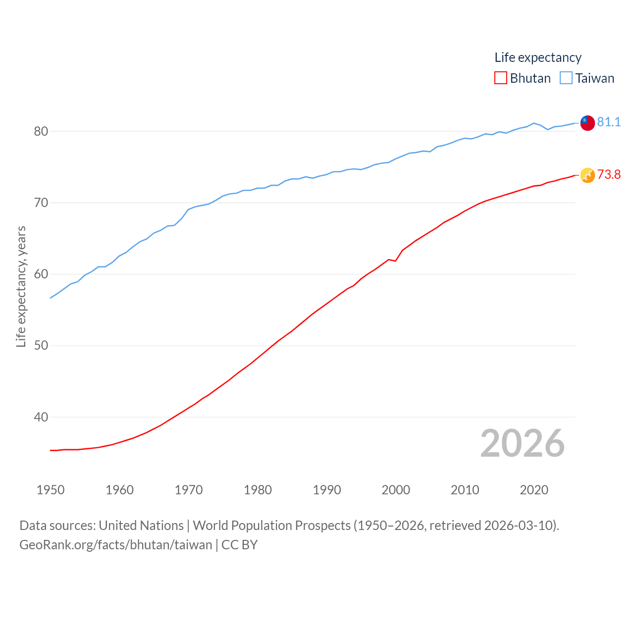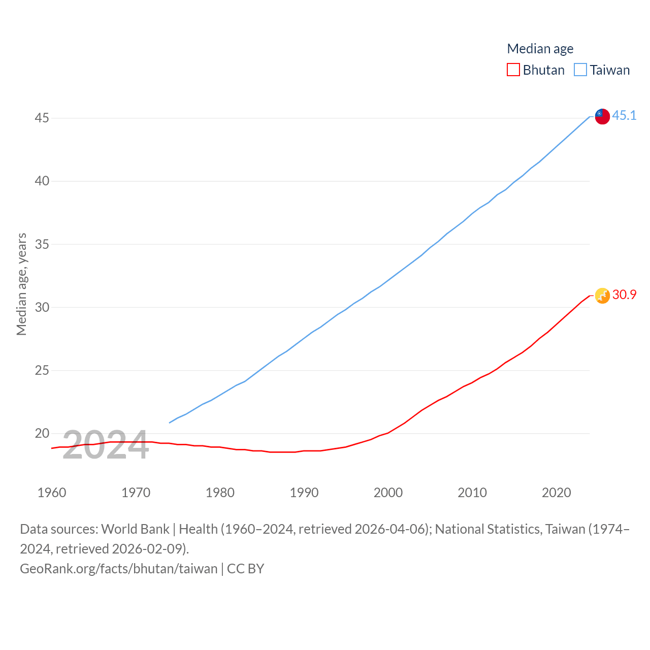 Bhutan has a population of 792K (ranked 163/197), compared with 23.3M in Taiwan (ranked 60/197). Bhutan's land area is 14,726 sq mi versus 13,976 sq mi for Taiwan (ranked 132nd vs. 133rd).