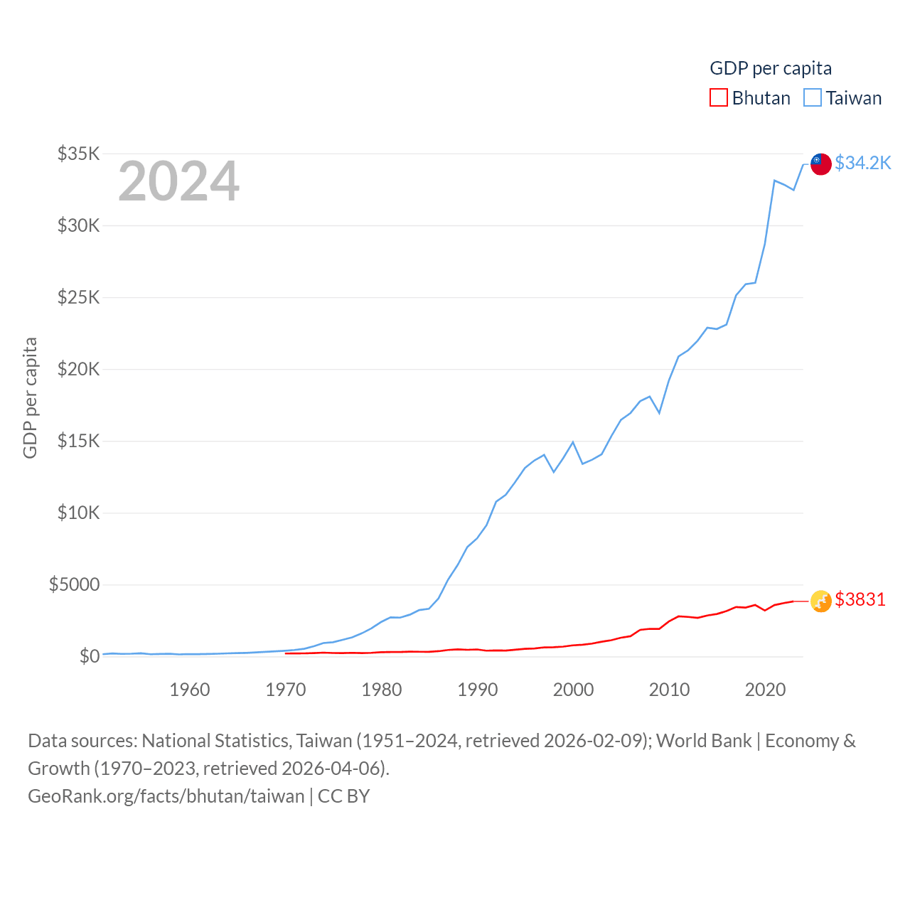 By GDP, Bhutan ranks 170/197 ($3.01B) and Taiwan ranks 22/197 ($802B). By GDP per capita, Bhutan ranks 132/197 ($3,831), while Taiwan ranks 35/197 ($34,238).