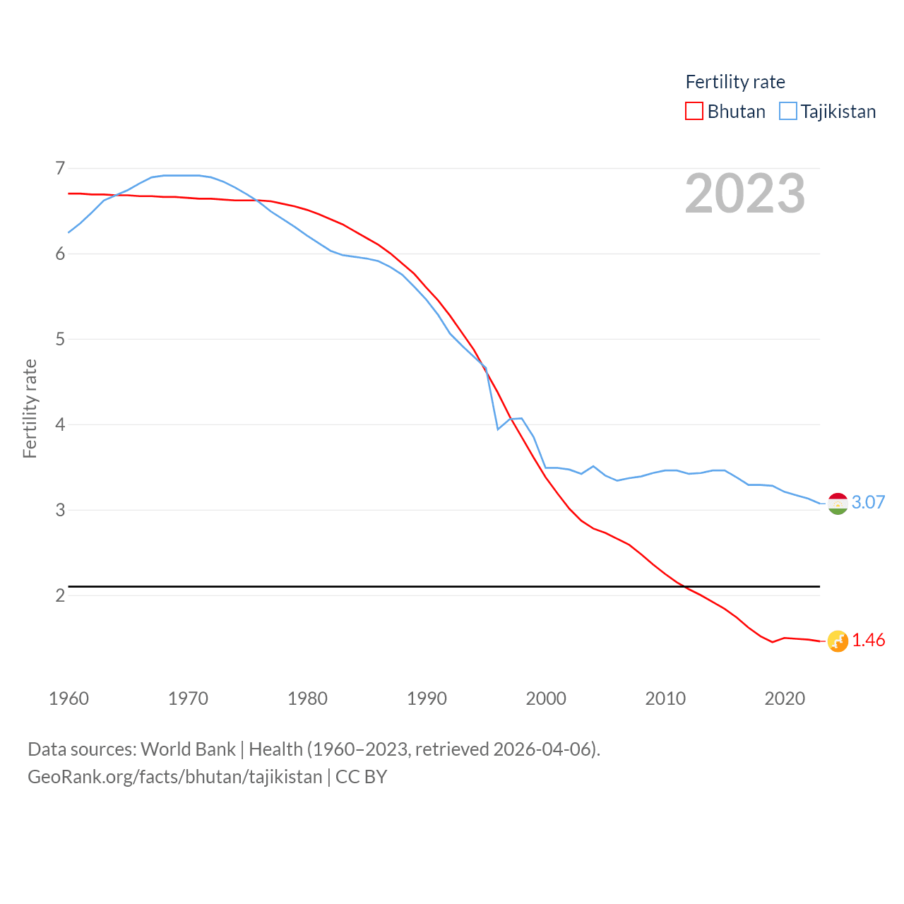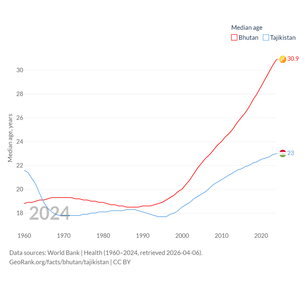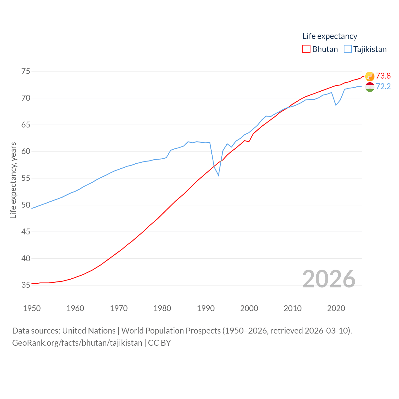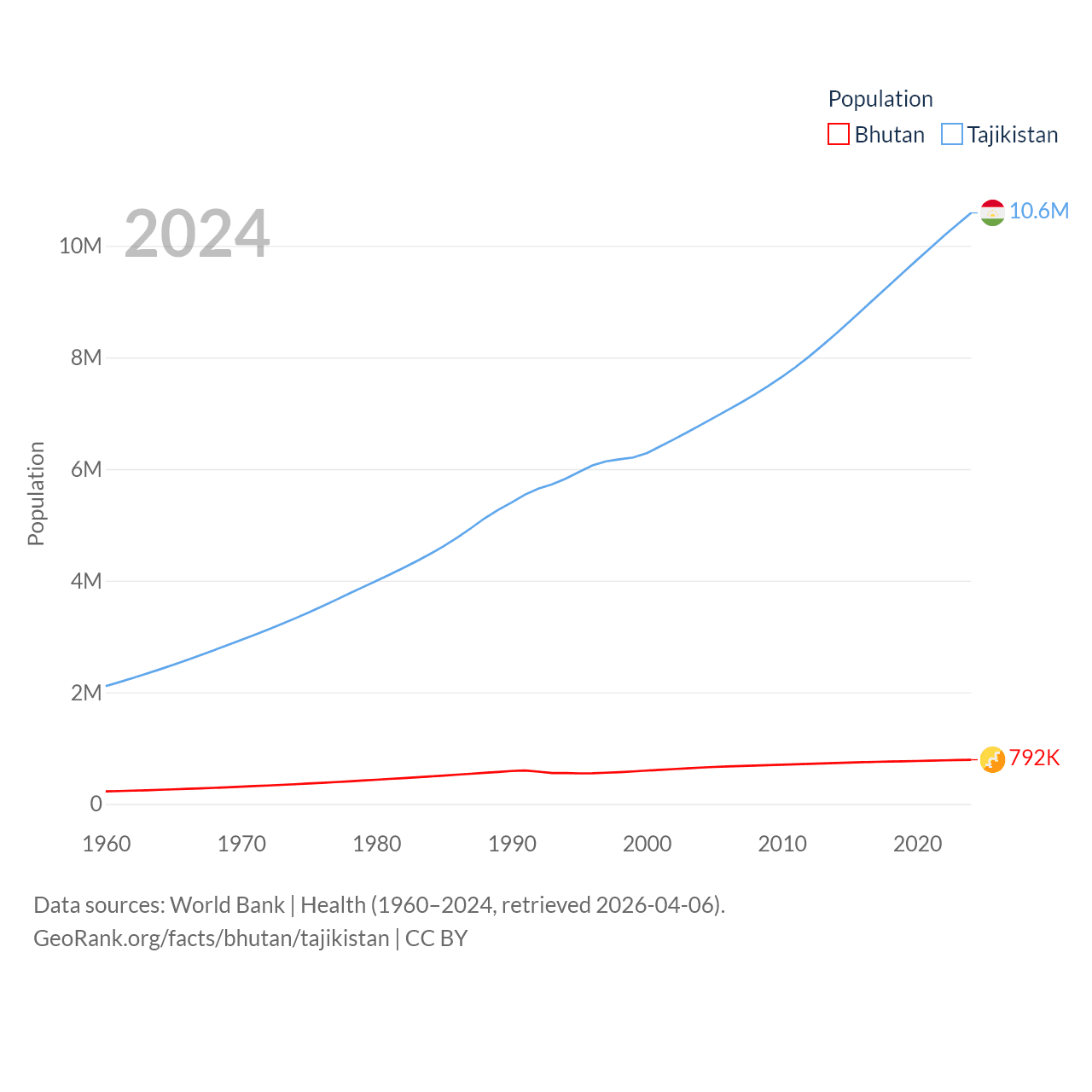 Bhutan has a population of 792K (ranked 163/197), compared with 10.6M in Tajikistan (ranked 91/197). Bhutan's land area is 14,726 sq mi versus 53,587 sq mi for Tajikistan (ranked 132nd vs. 93rd).