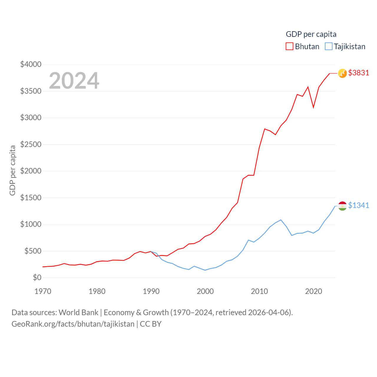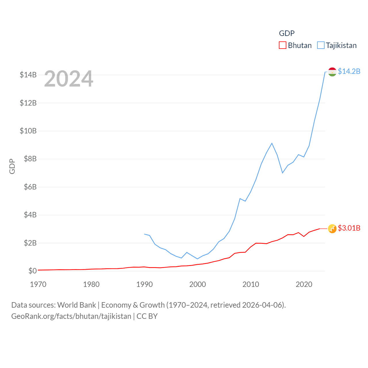 By GDP, Bhutan ranks 170/197 ($3.01B) and Tajikistan ranks 145/197 ($14.2B). By GDP per capita, Bhutan ranks 132/197 ($3,831), while Tajikistan ranks 166/197 ($1,341).