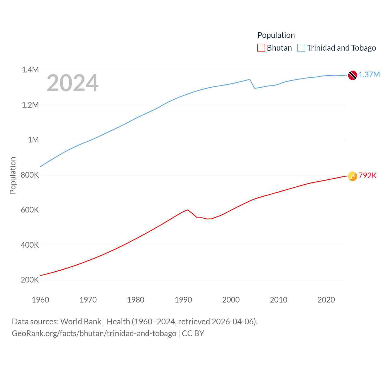 Bhutan has a population of 792K (ranked 163/197), compared with 1.37M in Trinidad and Tobago (ranked 154/197). Bhutan's land area is 14,726 sq mi versus 1,981 sq mi for Trinidad and Tobago (ranked 132nd vs. 166th).