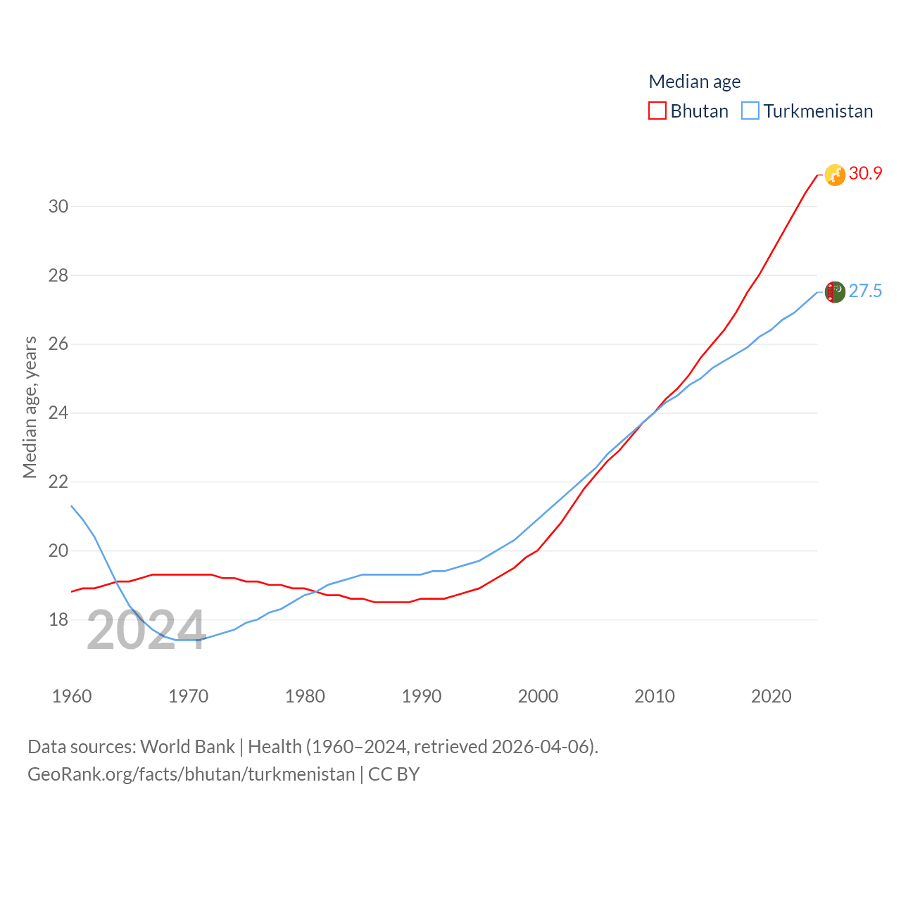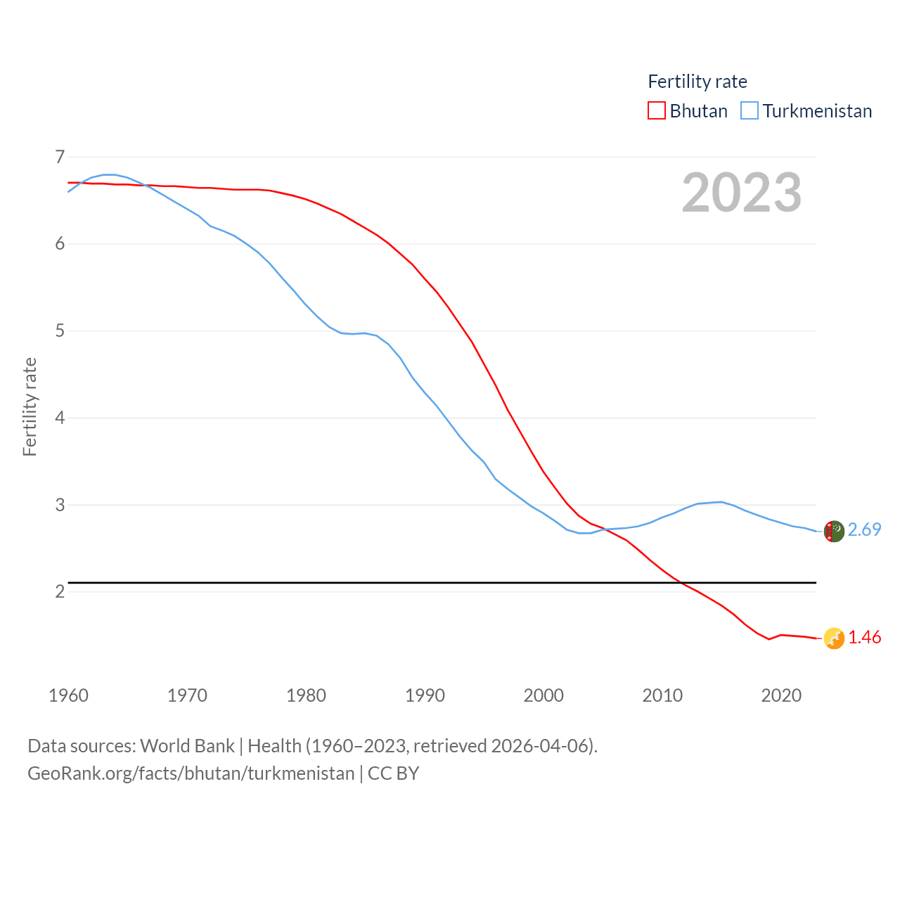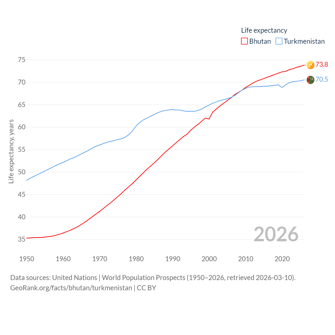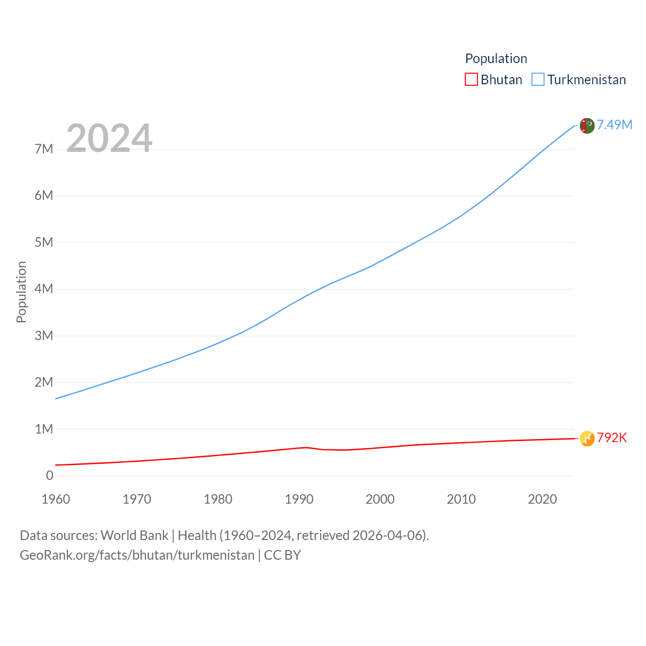 Bhutan has a population of 792K (ranked 163/197), compared with 7.49M in Turkmenistan (ranked 104/197). Bhutan's land area is 14,726 sq mi versus 181,441 sq mi for Turkmenistan (ranked 132nd vs. 53rd).