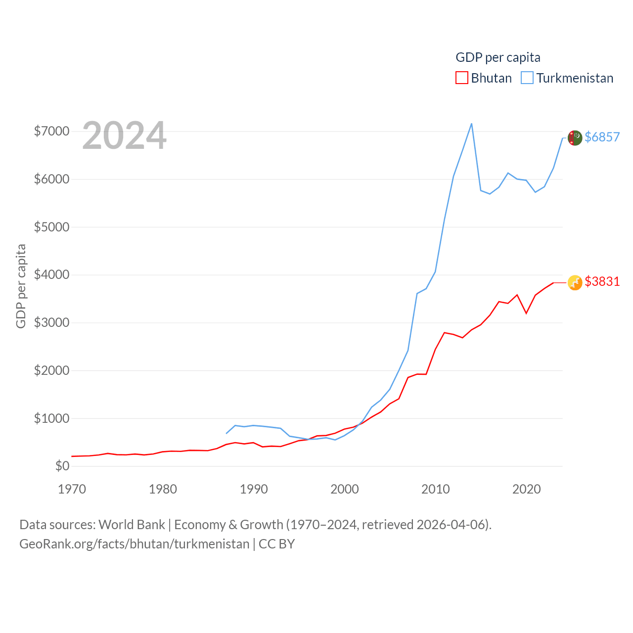 By GDP, Bhutan ranks 170/197 ($3.01B) and Turkmenistan ranks 92/197 ($51.4B). By GDP per capita, Bhutan ranks 132/197 ($3,831), while Turkmenistan ranks 104/197 ($6,857).