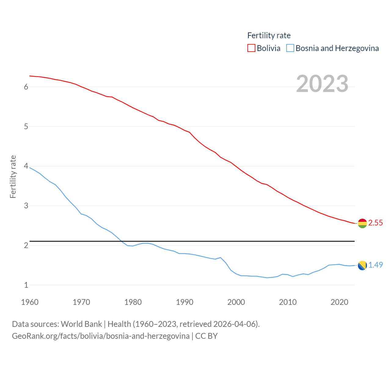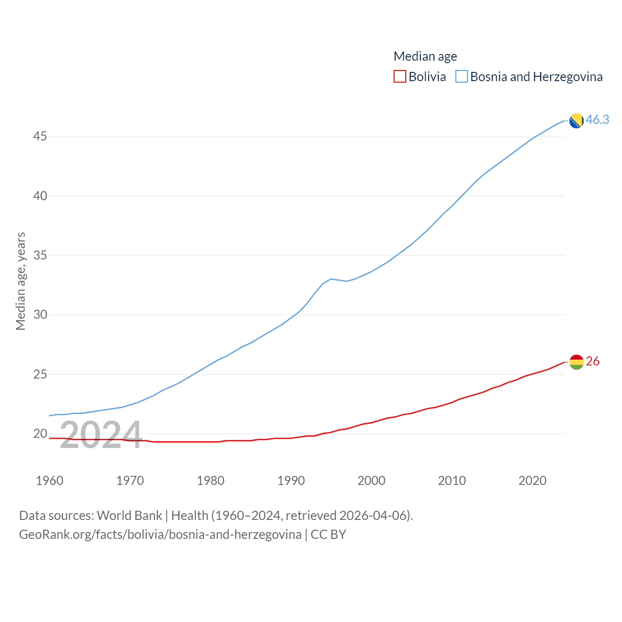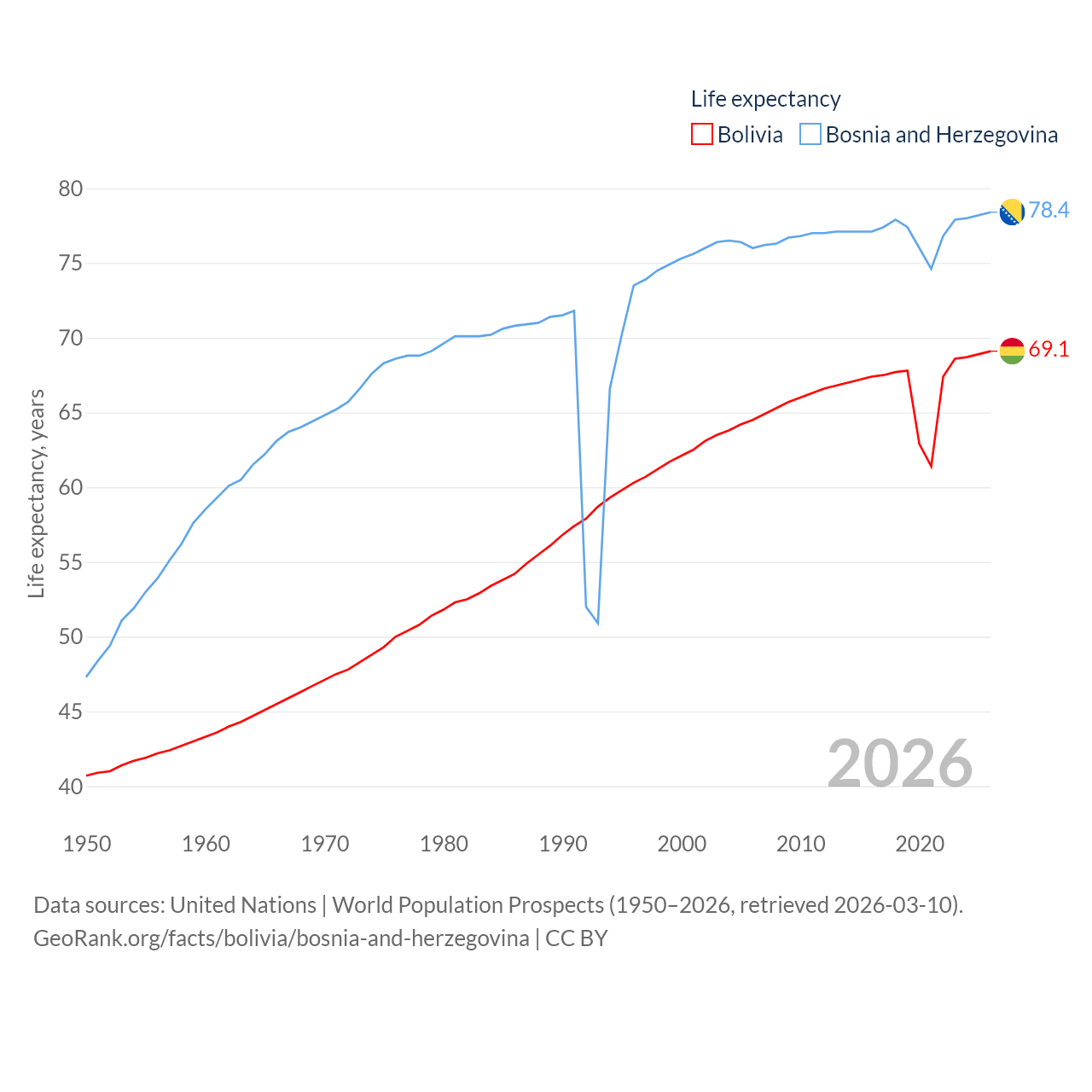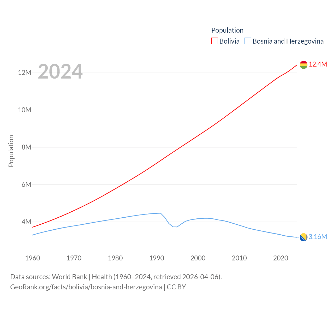 Bolivia has a population of 12.4M (ranked 79/197), compared with 3.16M in Bosnia and Herzegovina (ranked 134/197). Bolivia's land area is 418,264 sq mi versus 19,768 sq mi for Bosnia and Herzegovina (ranked 27th vs. 125th).