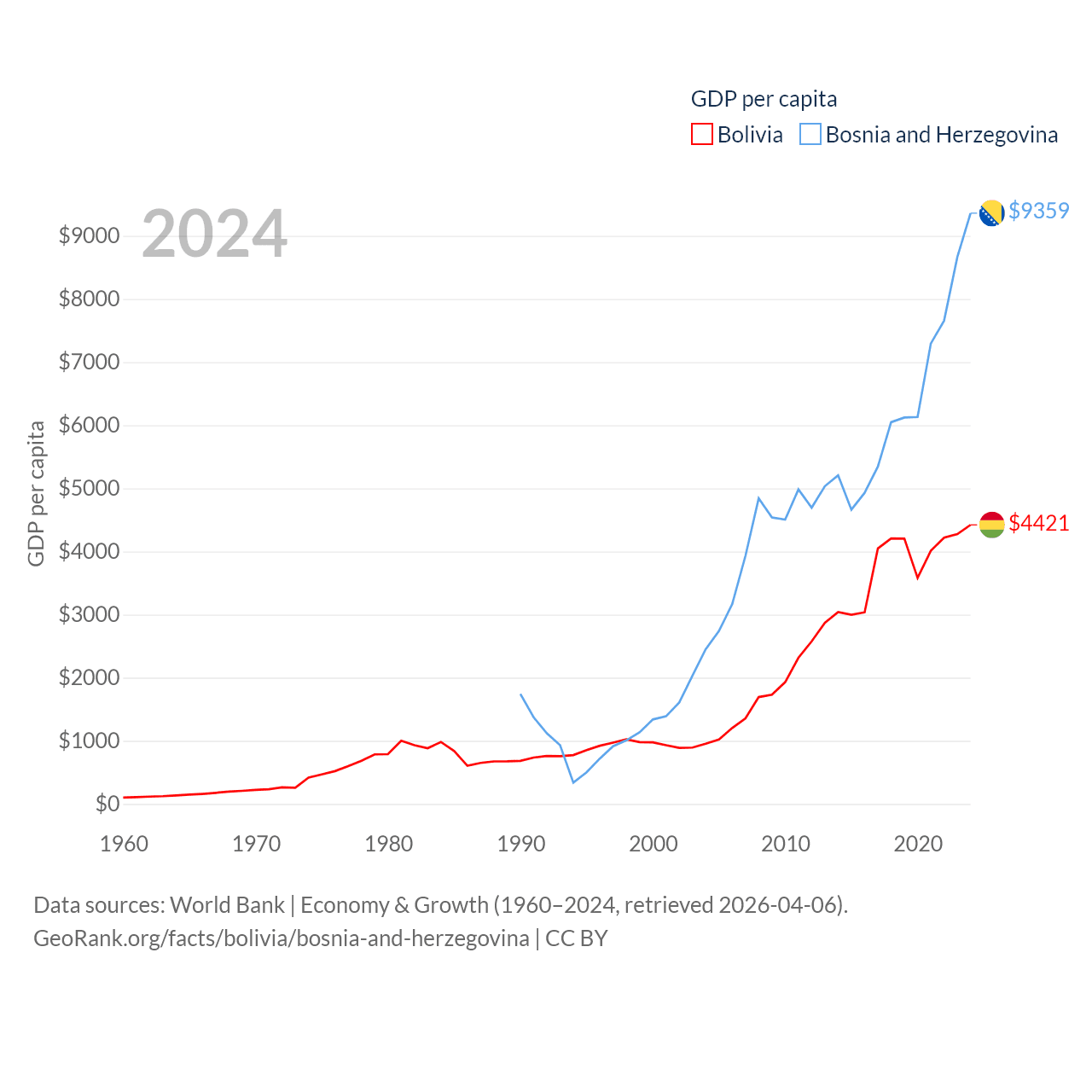 By GDP, Bolivia ranks 88/197 ($54.9B) and Bosnia and Herzegovina ranks 111/197 ($29.6B). By GDP per capita, Bolivia ranks 125/197 ($4,421), while Bosnia and Herzegovina ranks 87/197 ($9,359).