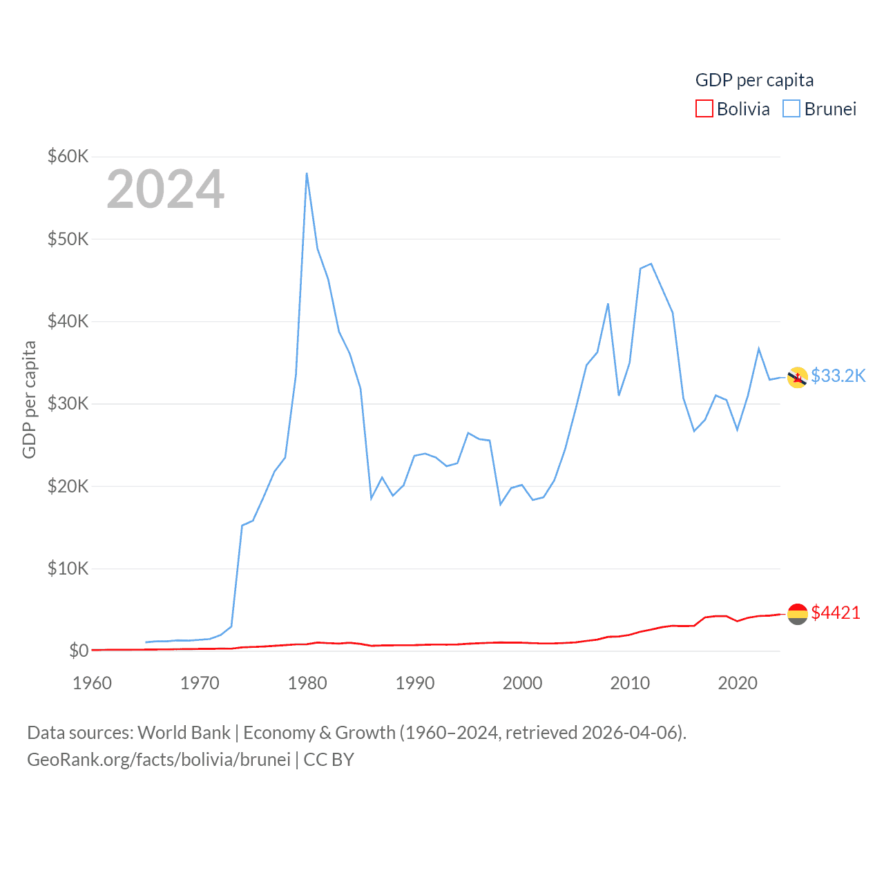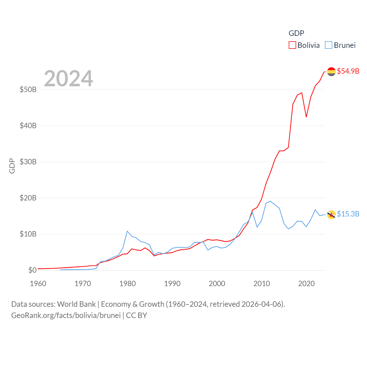 By GDP, Bolivia ranks 88/197 ($54.9B) and Brunei ranks 142/197 ($15.3B). By GDP per capita, Bolivia ranks 125/197 ($4,421), while Brunei ranks 36/197 ($33,153).