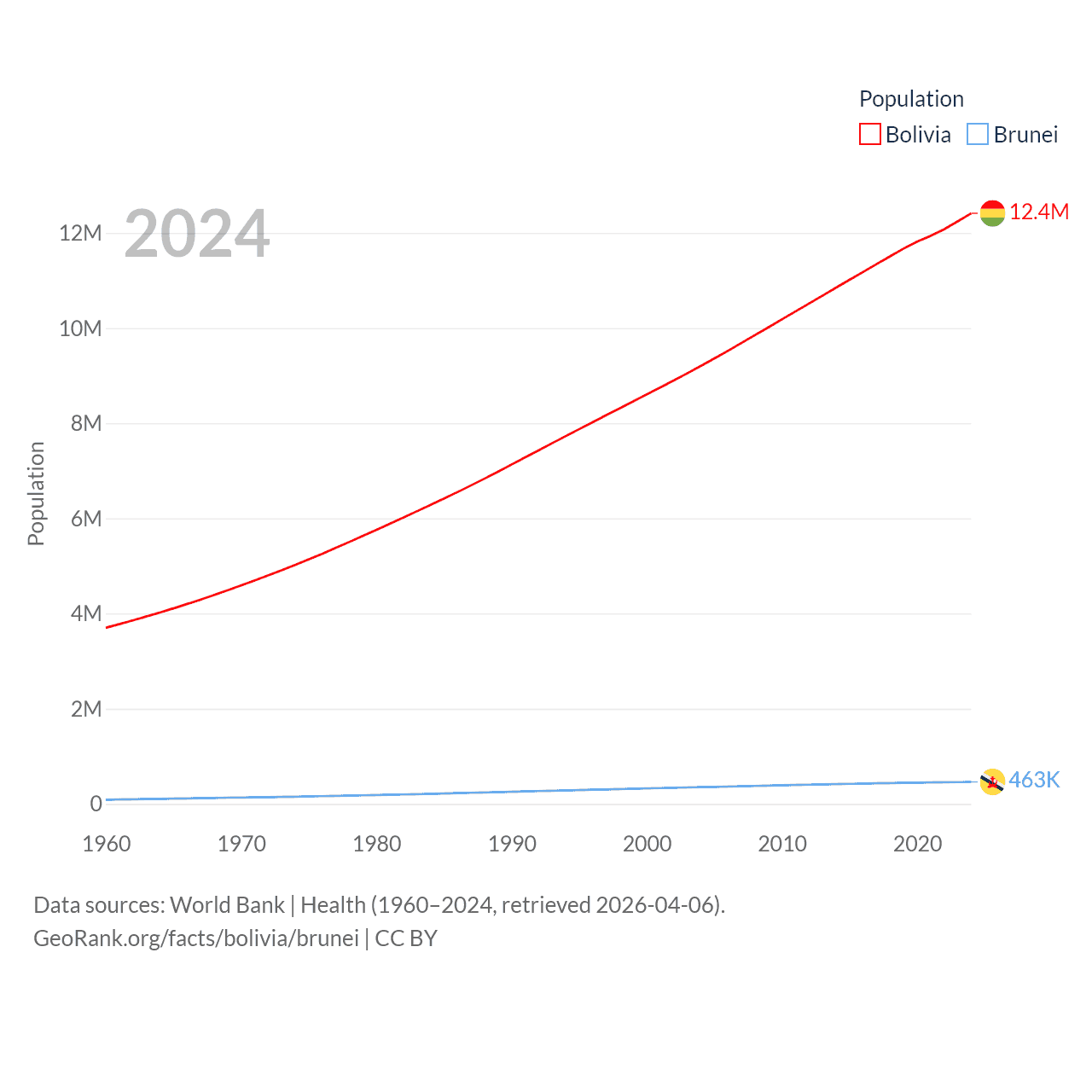 Bolivia has a population of 12.4M (ranked 79/197), compared with 463K in Brunei (ranked 170/197). Bolivia's land area is 418,264 sq mi versus 2,035 sq mi for Brunei (ranked 27th vs. 165th).