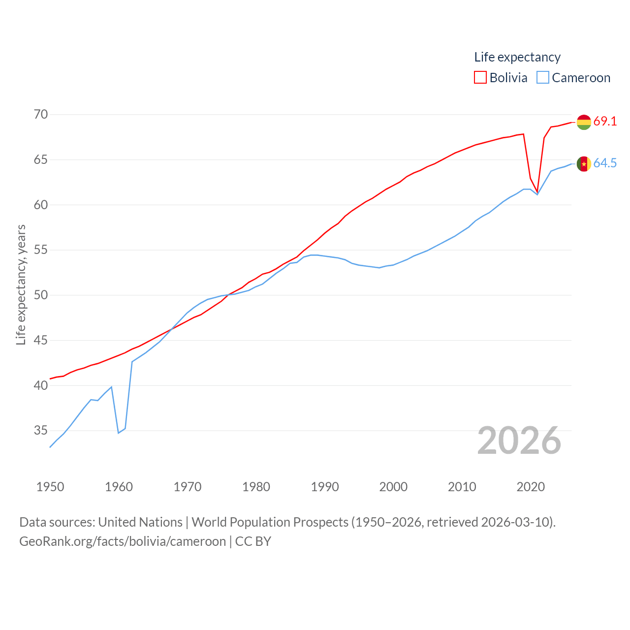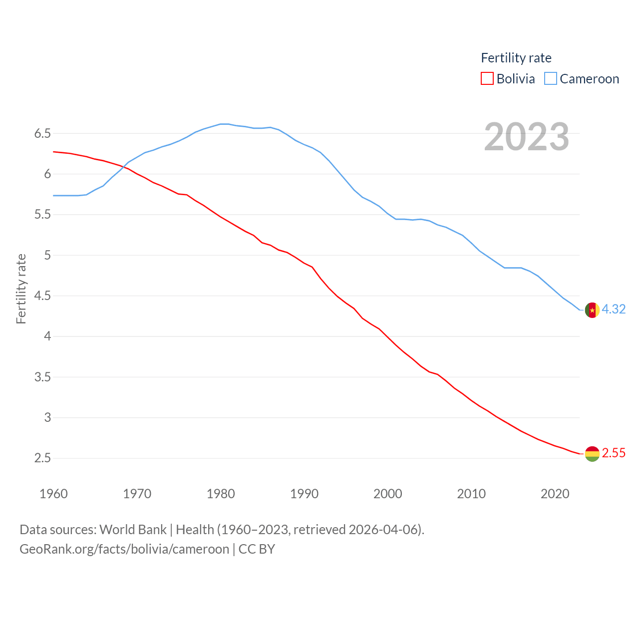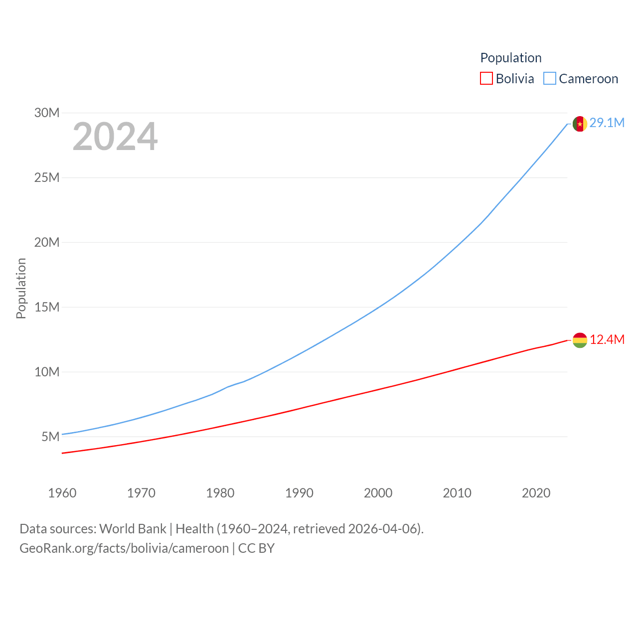 Bolivia has a population of 12.4M (ranked 79/197), compared with 29.1M in Cameroon (ranked 52/197). Bolivia's land area is 418,264 sq mi versus 182,514 sq mi for Cameroon (ranked 27th vs. 52nd).