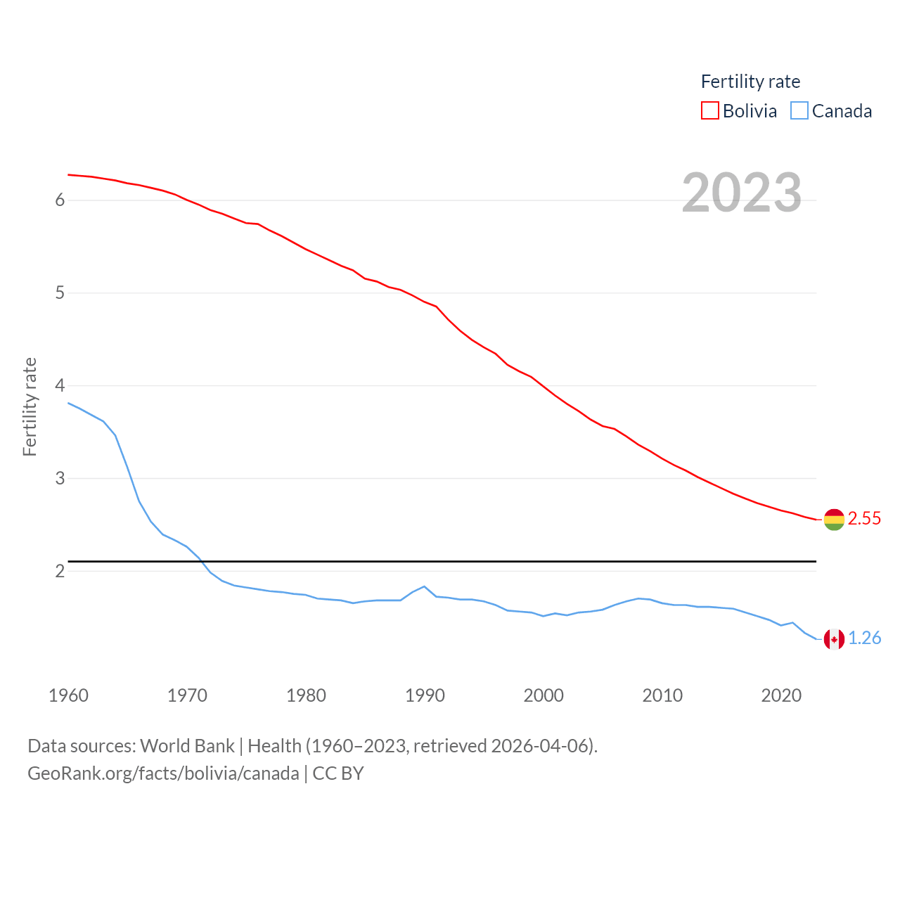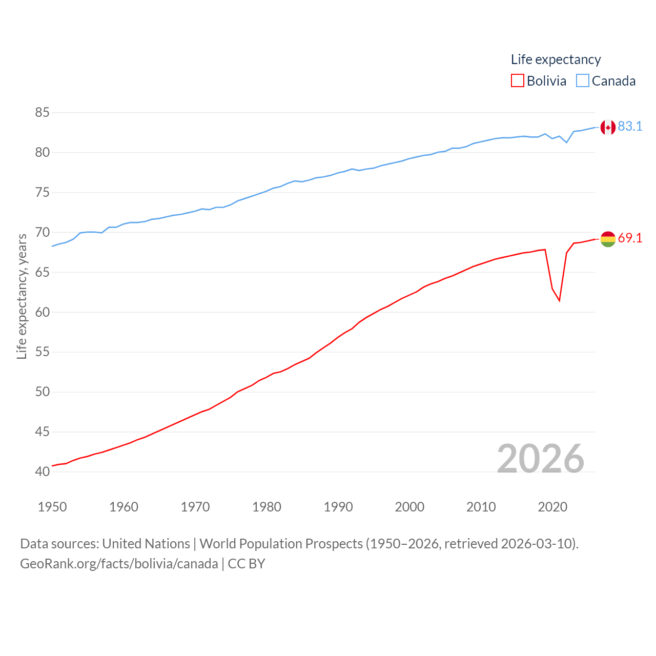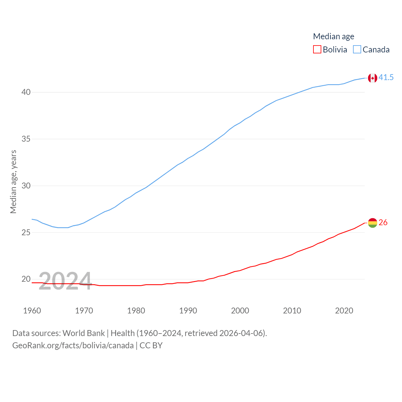 Bolivia has a population of 12.4M (ranked 79/197), compared with 41.3M in Canada (ranked 37/197). Bolivia's land area is 418,264 sq mi versus 3,393,336 sq mi for Canada (ranked 27th vs. 4th).