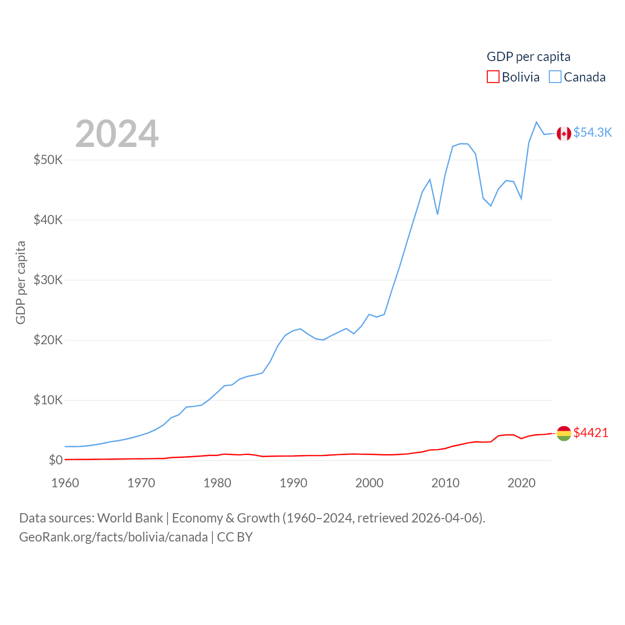 By GDP, Bolivia ranks 88/197 ($54.9B) and Canada ranks 9/197 ($2.24T). By GDP per capita, Bolivia ranks 125/197 ($4,421), while Canada ranks 20/197 ($54,340).