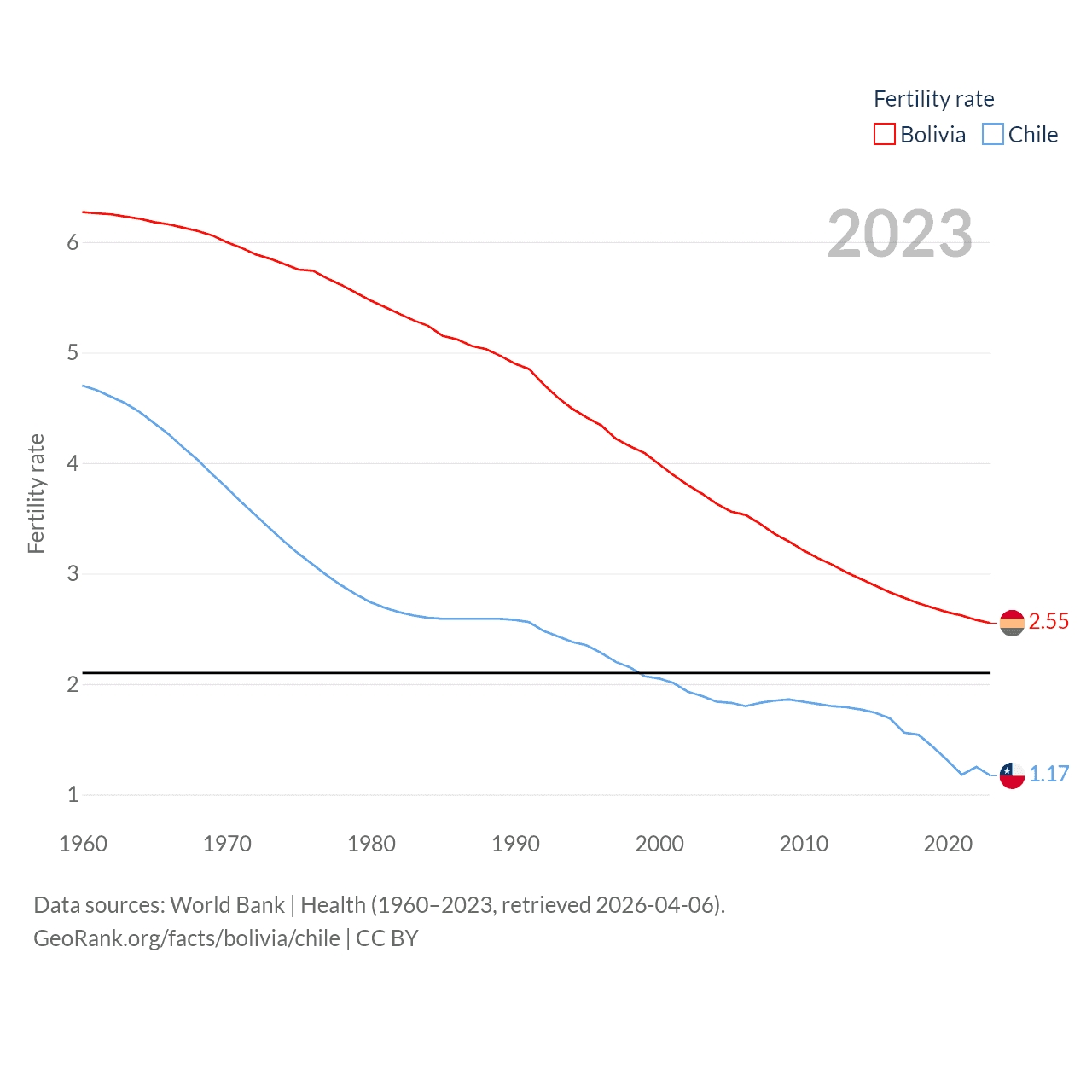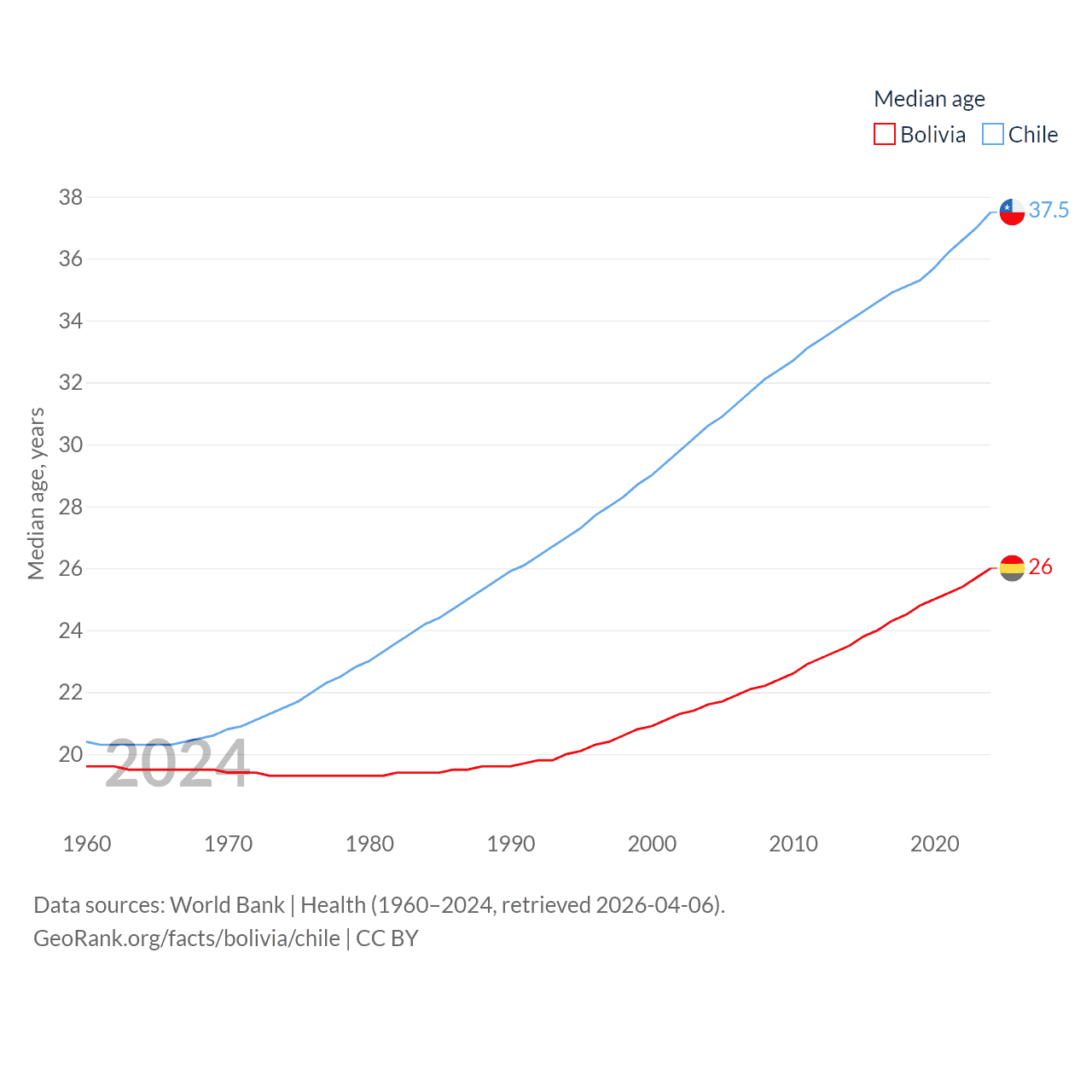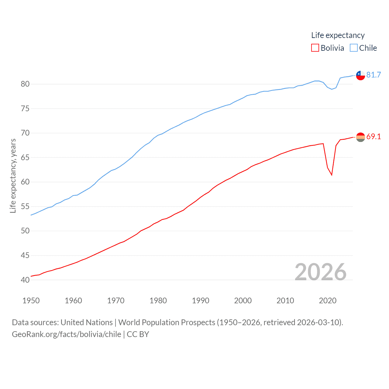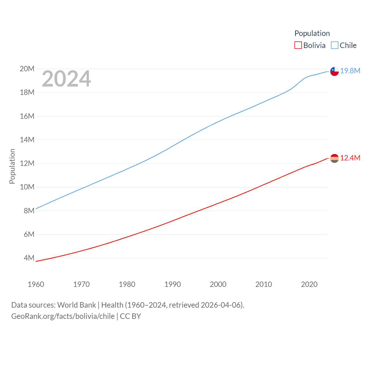 Bolivia has a population of 12.4M (ranked 79/197), compared with 19.8M in Chile (ranked 66/197). Bolivia's land area is 418,264 sq mi versus 286,809 sq mi for Chile (ranked 27th vs. 38th).