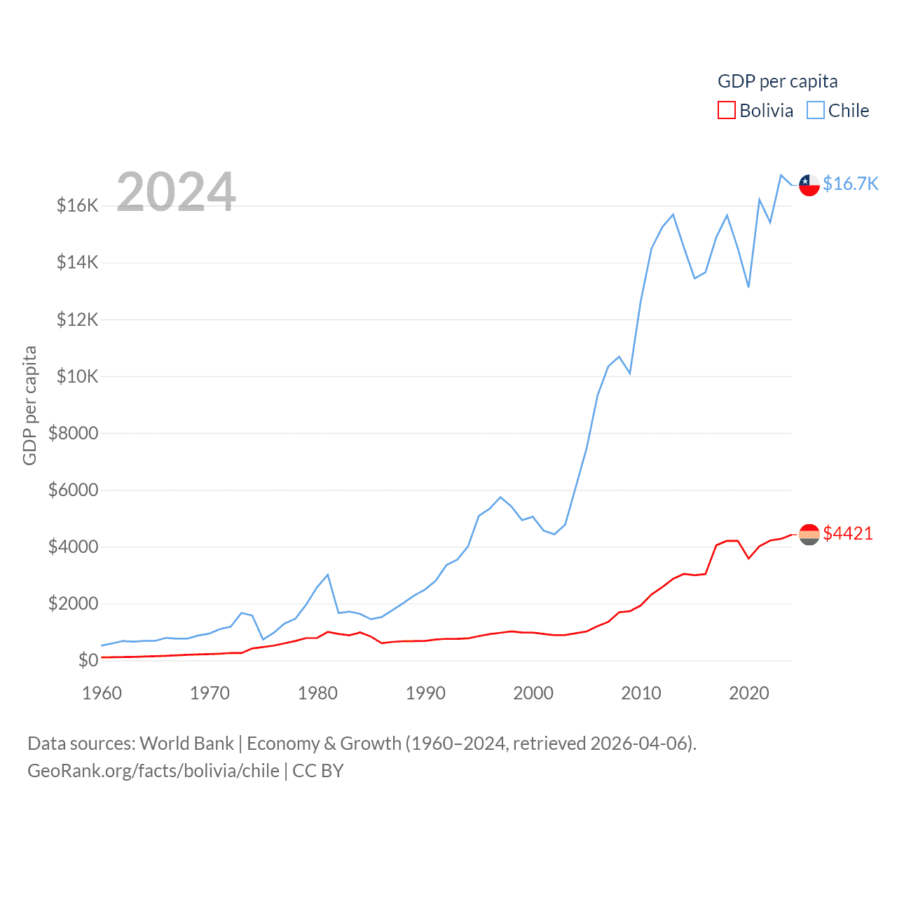 By GDP, Bolivia ranks 88/197 ($54.9B) and Chile ranks 45/197 ($330B). By GDP per capita, Bolivia ranks 125/197 ($4,421), while Chile ranks 65/197 ($16,710).