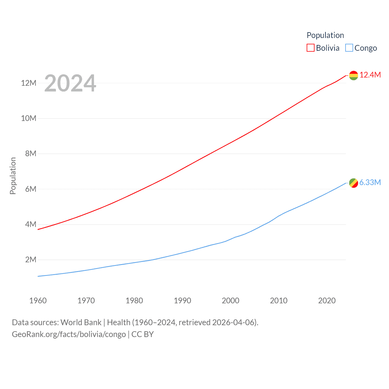 Bolivia has a population of 12.4M (ranked 79/197), compared with 6.33M in The Congo (ranked 112/197). Bolivia's land area is 418,264 sq mi versus 131,854 sq mi for The Congo (ranked 27th vs. 64th).