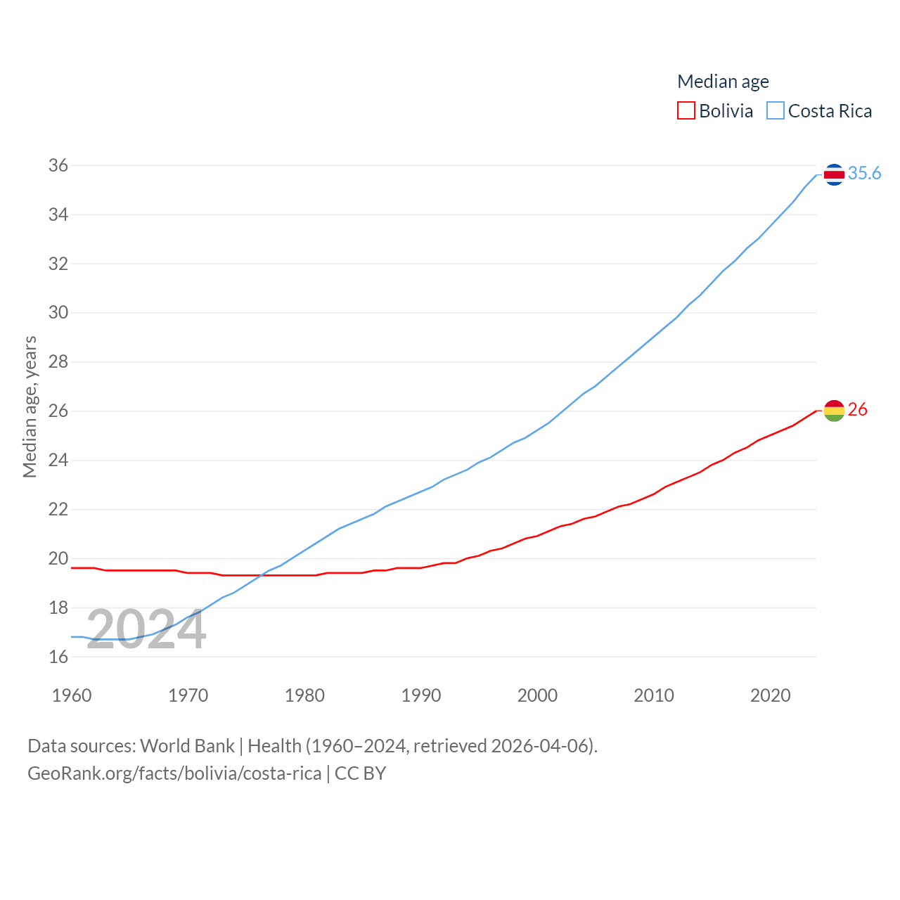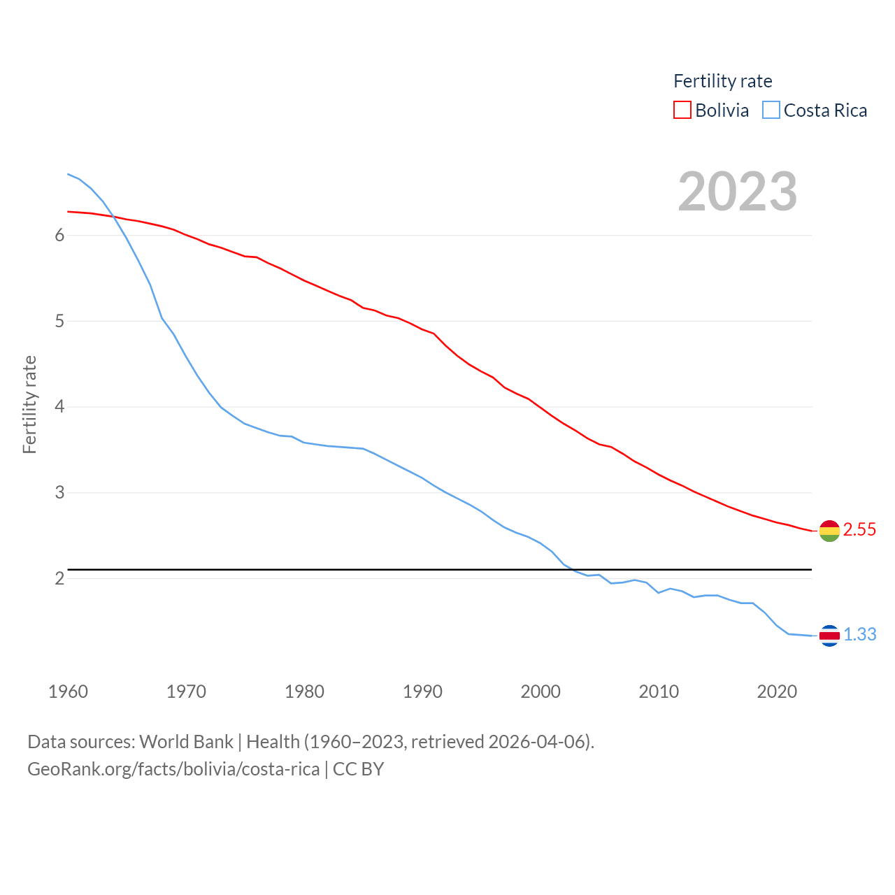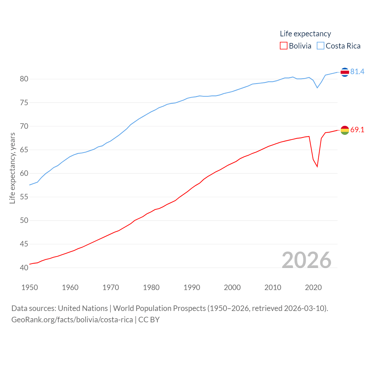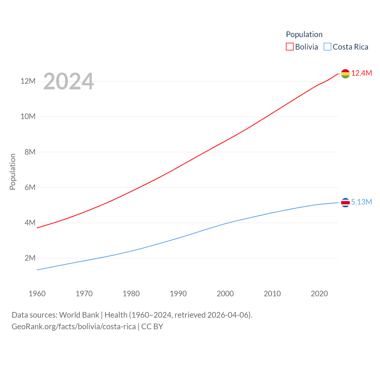 Bolivia has a population of 12.4M (ranked 79/197), compared with 5.13M in Costa Rica (ranked 126/197). Bolivia's land area is 418,264 sq mi versus 19,714 sq mi for Costa Rica (ranked 27th vs. 126th).