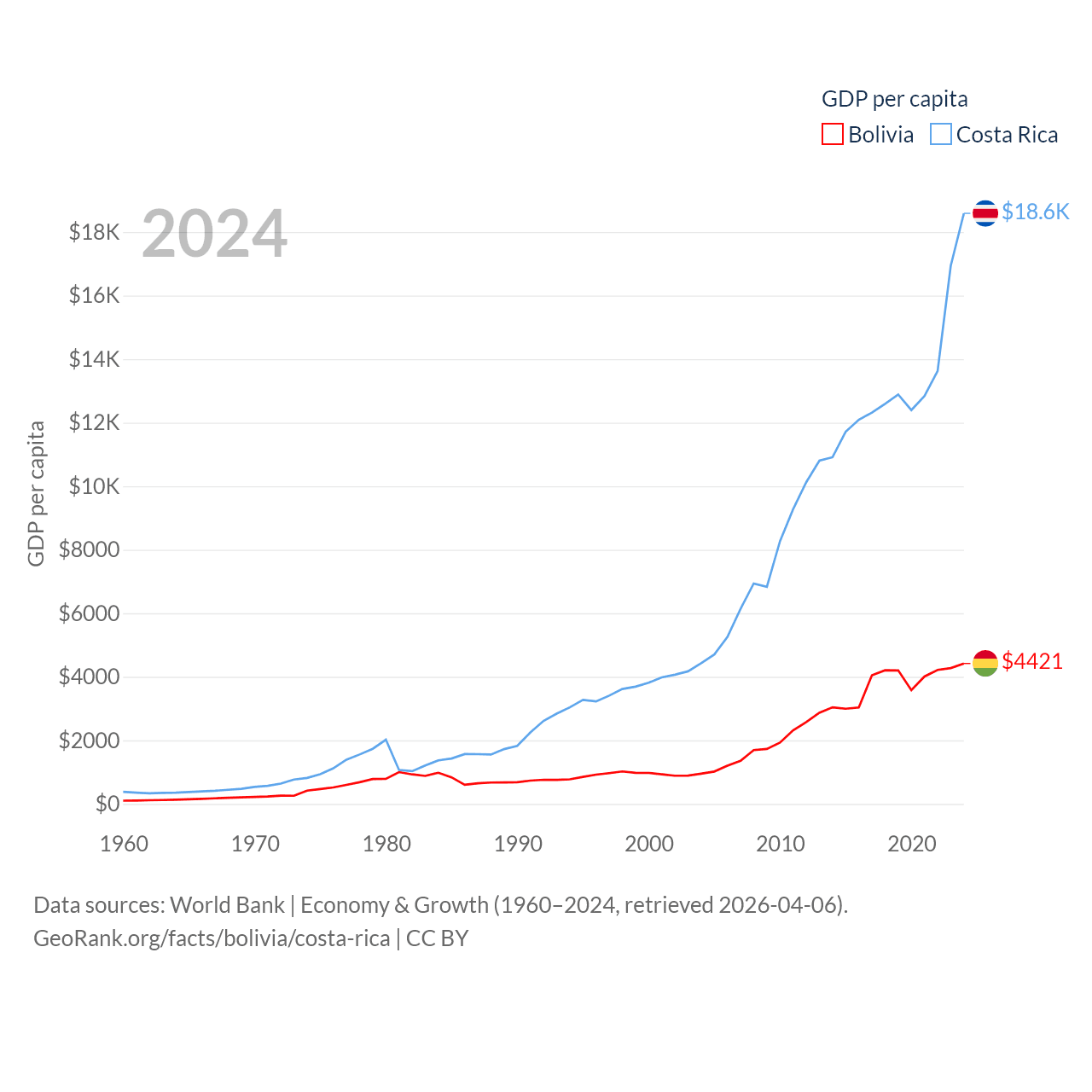 By GDP, Bolivia ranks 88/197 ($54.9B) and Costa Rica ranks 73/197 ($95.4B). By GDP per capita, Bolivia ranks 125/197 ($4,421), while Costa Rica ranks 62/197 ($18,587).